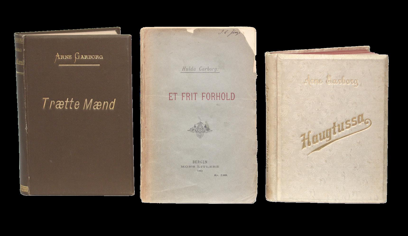 100 GARBORG, Arne: Haugtussa. Forteljing. Kristiania. 1895. Liten 8vo. (4), 223 s. Orig. beige helshirtingbd. Ryggen mørknet/litt uren. Bindet litt slitt/ litt urent. Selv med de beskrevne smålyter, et meget bra eksemplar. (135758) 3.000,-