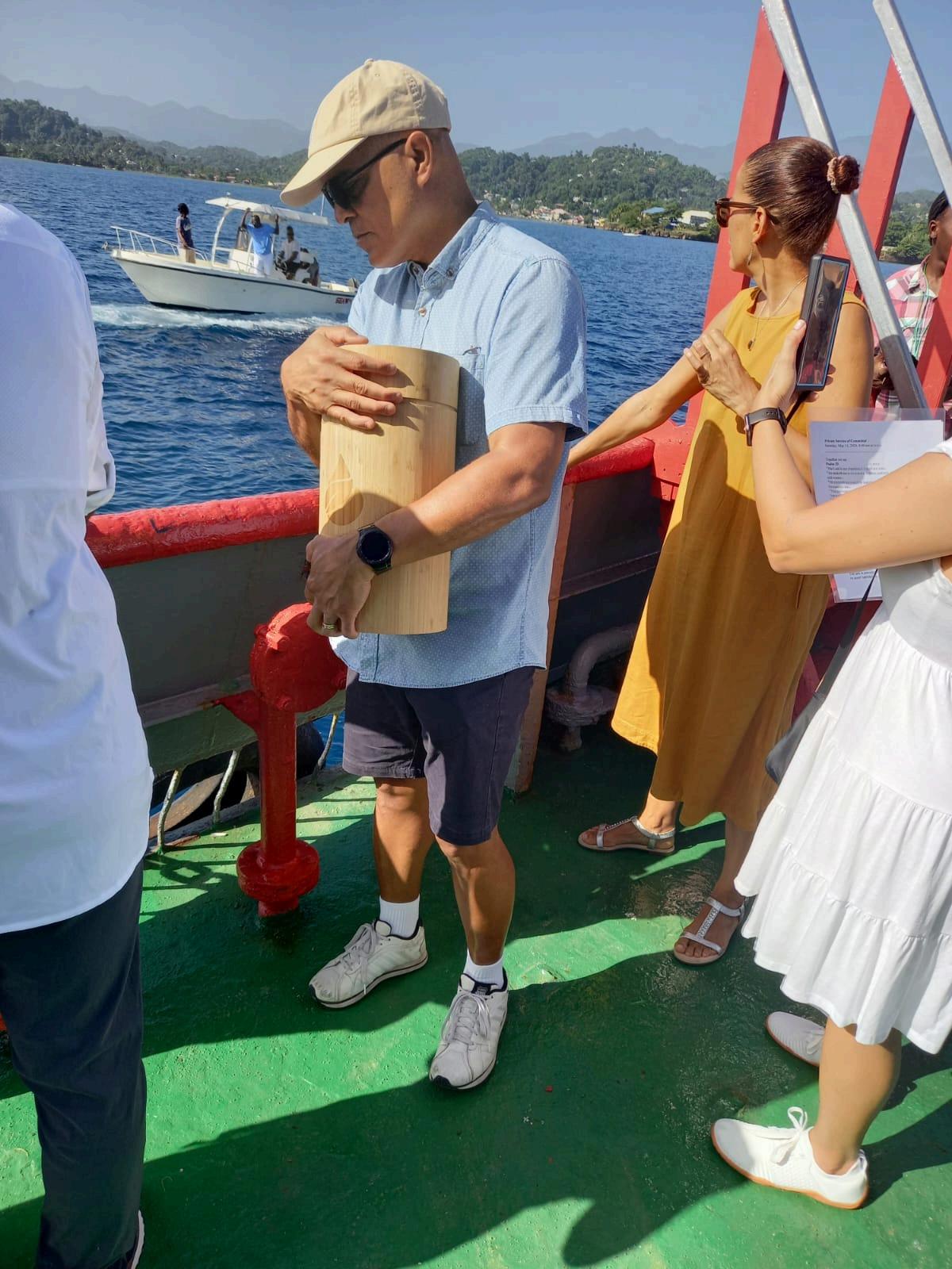 After masterfully taking the George Munro from Port Esquivel to Port Antonio and a month of extensive renovation, CAPTAIN KAREEM ROBINSON brings her to rest in the water With the horns blaring he pays respect with a final SALUTE to Pilot George Munro as his urn is placed in the Caribbean Sea