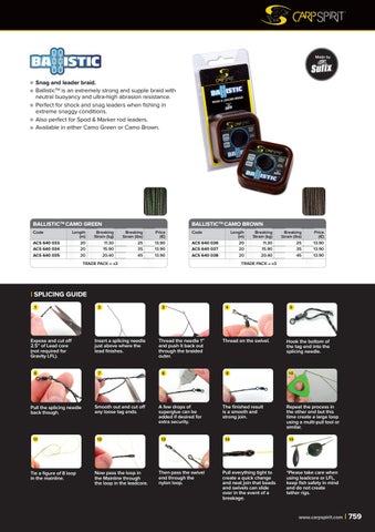 Snag and leader braid. BallisticTM is an extremely strong and supple braid with neutral buoyancy and ultra-high abrasion resistance. Perfect for shock and snag leaders when fishing in extreme snaggy conditions. Also perfect for Spod & Marker rod leaders. Available in either Camo Green or Camo Brown.