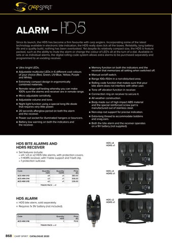 Set features include: – x4 / x3 or x2 HD5 bite alarms, with protection covers. – 1 HDR5 receiver, with 1 table support and 1 belt clip. – 1 protection suitcase.