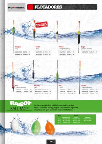 De forma aerodinámica, El Ballrag es indestructible, rebota contra las rocas y propulsa los señuelos a grandes distancias con gran precisión. Referencia flotante. Peso Colores Fosforescente Blanco Naranja 30 g RG3251133 RG3251153 RG3251163 40 g RG3251134 RG3251154 RG3251164 60 g RG3251136 RG3251166