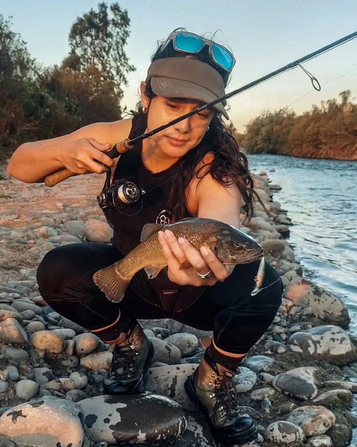 Desde muy chiquita tuve una relación cercana con la pesca, recuerdo que acompañaba al río a mi padre, en primera instancia como espectadora, y tiempo después tomé la caña y no la solté más. Poco a poco fui aprendiendo por mi cuenta, indagando en internet, era re curiosa, veía muchos videos para irme puliendo, y sobre todo, lo que más llamaba mi atención era la pesca de truchas, definitivamente mi pez favorito. Pescar para mí es todo un mundo, me encanta vadear ríos pequeños, entre árboles y martines pescadores. Todos deberíamos, en algún momento de la vida, tener la satisfacción de sentir un buen pique.