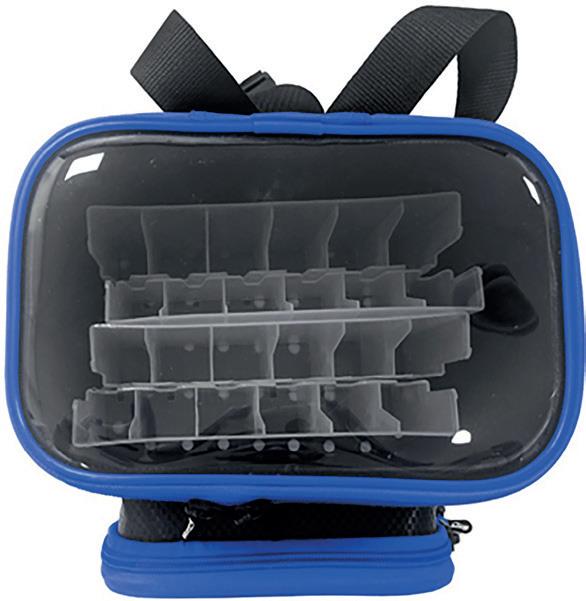 Bolsa especial para señuelos con cuatro separadores extraíbles para mantener los señuelos separados y evitar que los anzuelos se enreden. Fabricada en material EVA imputrescible y acabado 3K. Orificios de evacuación de agua en la parte inferior de la bolsa para enjuagar con agua dulce. Correa ajustable. Tapa transparente para ver fácilmente los señuelos en el interior. Bolsillo frontal con cierre de cremallera para guardar llaves, teléfono o accesorios. Tejido: revestimiento de PVC de 0,8 mm + cuerpo de EVA de 0,8 mm + fondo de 1,2 mm.