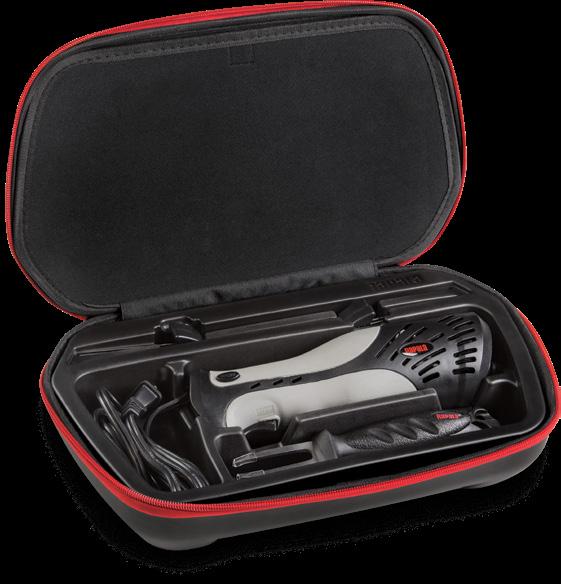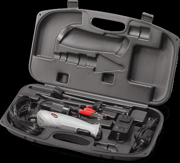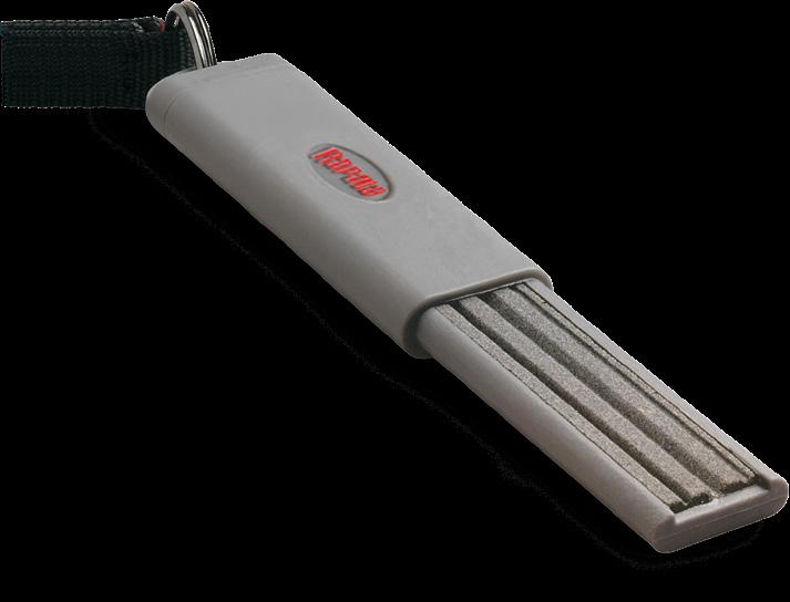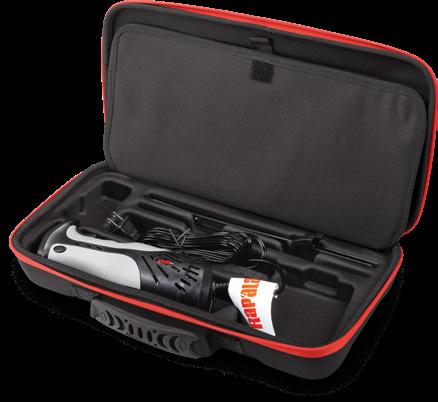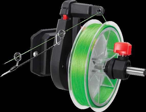 This handy tool strips line via enhanced stripper wheel, at 5 feet of line per second. High torque motor is powered by 4 AA batteries (not included), also features a built-in hook sharpener with fine grade aluminum oxide stone.