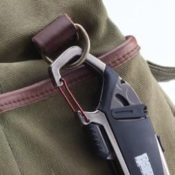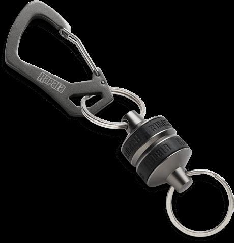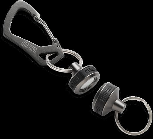 360° rotating, quick release carabiner with split ring for tool attachment.