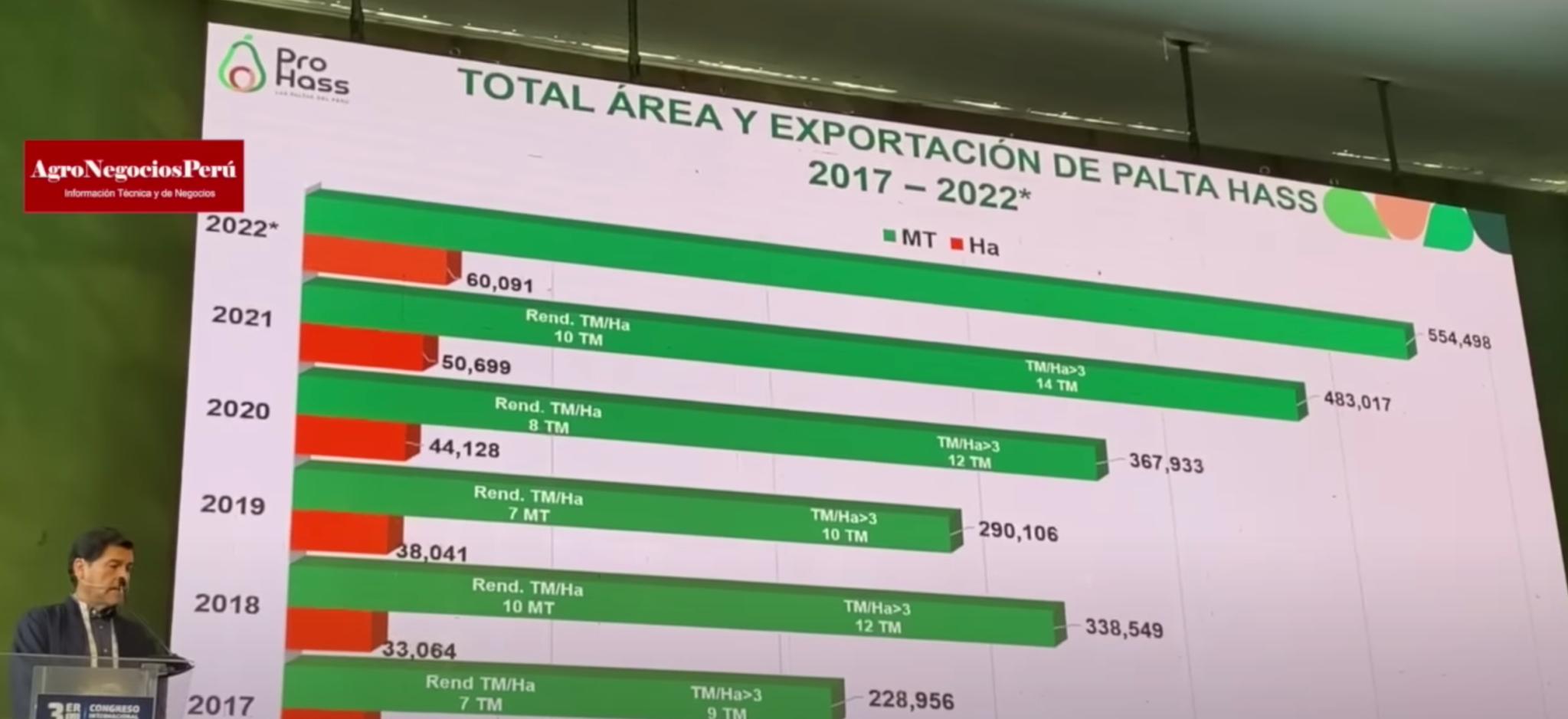 Mostrando estadísticas de fuentes oficiales, Paredes informó que en el presente año hubo un crecimiento del un 15% en las exportaciones de palta hass con 554 mil toneladas, un crecimiento que venía parejo en los últimos 10 años aunque más acentuado en los últimos tres.