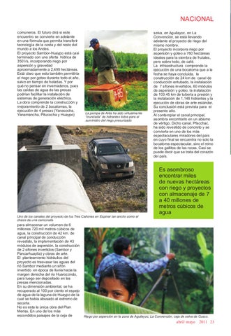 NACIONAL comuneros. El futuro dirá si este en Aguilayoc,lo enpiden La Comisión de promoción de la subasta puede cambiar la fecha selva, si interesados encuentro se convierte en adelante Convención, se está llevando en una fórmula que permita transferir adelante el proyecto de riego del tecnología de la costa y del resto del mismo nombre. mundo a los Andes. El proyecto incorpora riego por El proyecto Sambor-Huaypo está casi aspersión y goteo a 760 hectáreas terminado con una oferta hídrica de ideales para la siembra de frutales, 350 l/s, incorporando riego por pero sobre todo, de café. aspersión y gravedad La infraestructura comprende la aproximadamente a 2,495 hectáreas. ejecución de una bocatoma que a la Está claro que esto también permitiría fecha se haya concluida, la el riego por goteo durante todo el año, construcción de 24 km de canal de salvo en tiempo de heladas. Y por conducción entubado, la instalación qué no pensar en invernaderos, pues de 7 sifones invertidos, 60 módulos las caídas de agua de las presas de aspersión y goteo, la instalación podrían facilitar la instalación de de 103.45 km de tubería a presión y sistemas de generación eléctrica. la instalación de 1,148 hidrantes y la La obra comprende la construcción y ejecución de obras de arte estándar. mejoramiento de 2 bocatomas, la Su conclusión está prevista para el ejecución de 4 presas (Yanacocha, presente año. La pampa de Anta ha sido virtualmente Yanamancha, Pitucocha y Huaypo) Al contemplar el canal principal, “inundada” de hidrantes listos para el asombra encontrarlo en un abismo suministro del riego presurizado de vértigo. Dicho canal, Pfacchac, ha sido revestido de concreto y se convierte en uno de los más espectaculares miradores del país en cuyo final se encuentra no solo la bocatoma espectacular, sino el reino de los gallitos de las rocas. Casi se puede decir que se trata del corazón del país.