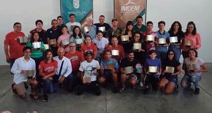 Los premiados posan con sus reconocimientos en el salón de usos múltiples del Instituto Municipal del Deporte de Mazatlán.