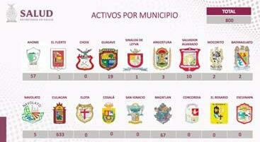 Culiacán es el foco de concentración de casos activos con 633, seguido de Mazatlán con 67, Ahome reportó 57, Guasave con 19 y Salvador Alvarado con 10.