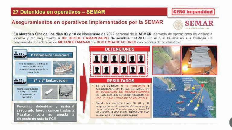 los días 09 y 10 de noviembre de 2022, personal de Semar, derivado de operaciones de vigilancia, localizó y dio seguimiento a un buque camaronero de nombre Tapilu II, el cual llevaba en sus bodegas un cargamento considerable de metanfetaminas y dos embarcaciones con bidones de combustible”, dice la lámina informativa presentada.