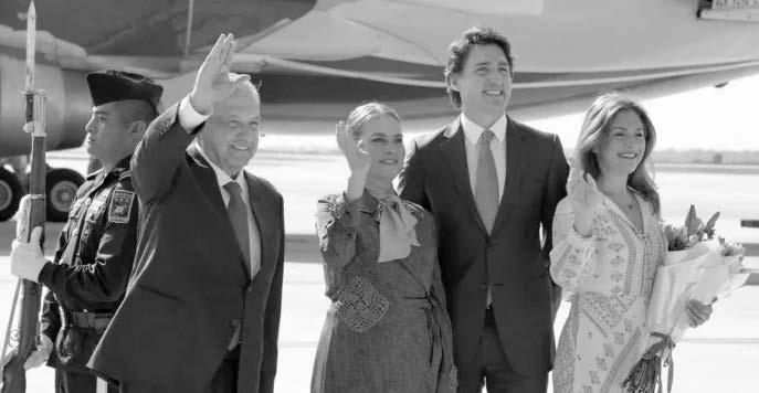Además de la guardia de honor montada por elementos de la Secretaría de la Defensa Nacional, al pie del avión recibieron al Primer Ministro canadiense y a su esposa, el Presidente López Obrador acompañado de su esposa, la doctora Beatriz Guitíerrez; así como el Canciller Marcelo Ebrard y el Embajador de Canadá en México, Graeme C. Clark.