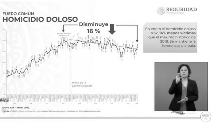 Pese al aumento, informó que el homicidio doloso tuvo en enero del 2023, un total de 16 por ciento menos víctimas respecto al máximo histórico, registrado en julio del 2018, cuando se registraron 3 mil 074 asesinatos.