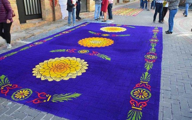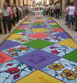 Elche de la Sierra ligger i Albaceteprovinsen i Castilla la Mancha (og bør ikke forveksles med Elche i Alicanteprovinsen). Ved siste folketelling hadde Elche de la Sierra rundt 3500 innbyg- gere. Hvert år i slutten av mai pyntes byens gater med blomstrete ‘tepper’ som er laget av farget sagflis. Flisen kommer fra det lokale sagbruket og blandes i store krukker som inneholder forskjellige farger maling. Deretter blir flisen tørket før den legges i sirlige mønstre i de smale gatene. Arrangementet trekker til seg et stadig økende antall turister.