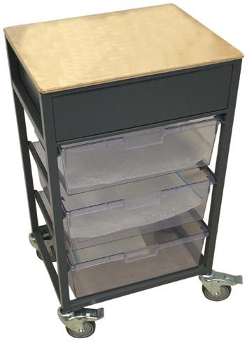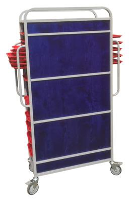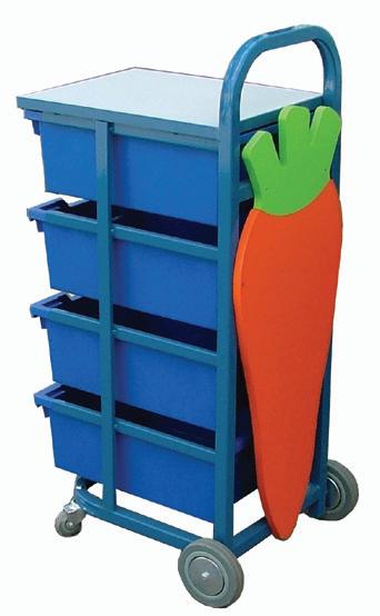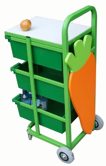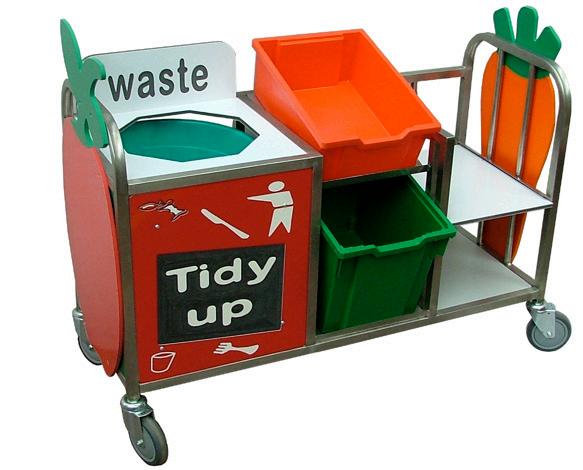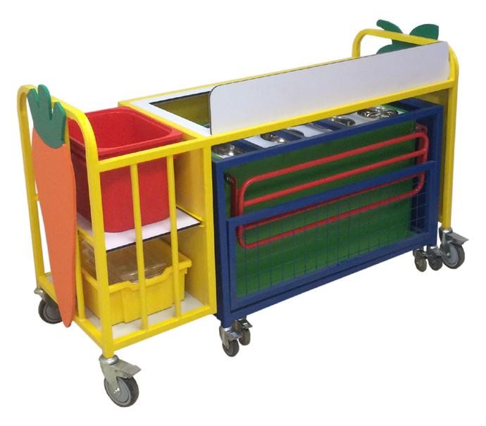 Supplied as shown with fruits, bowls and bins. These trolleys are ideal for school with little space available for storage.