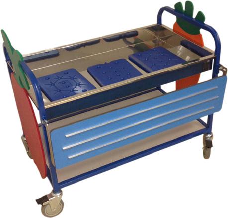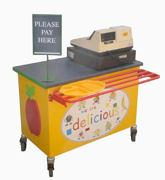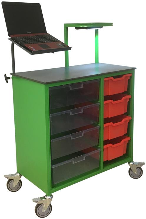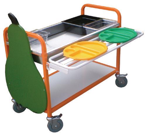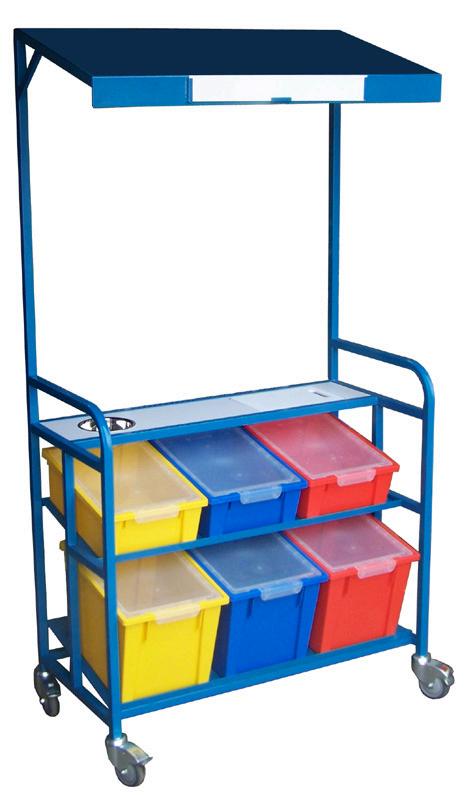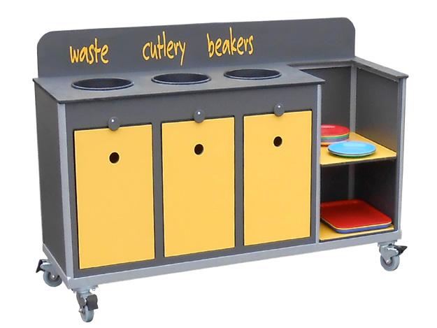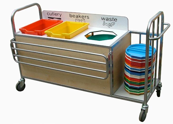 Supplied as shown with fruits, bowls and bins. These trolleys are ideal for schools with little space available for storage.