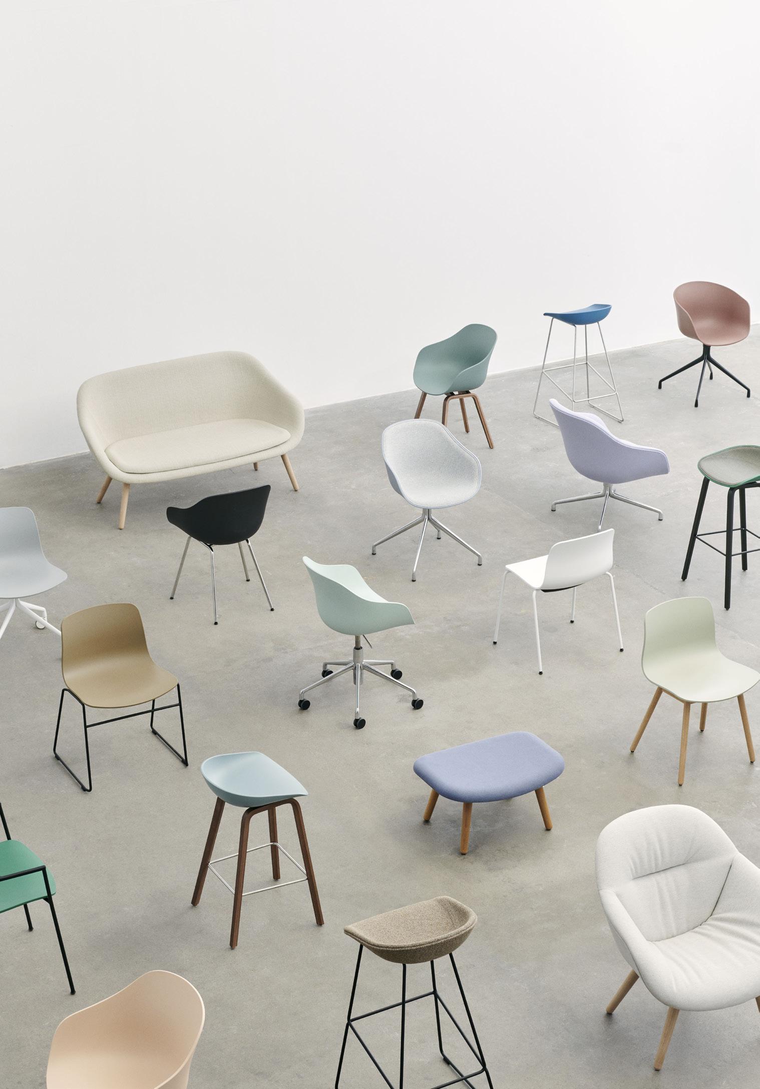 Designed for HAY by Hee Welling, the iconic About A Collection is a multi-functional family of chairs and stools connected around one simple, strong idea, while still retaining the individual qualities of each model. The About A Collection is HAY’s most versatile furniture series, comprising dining and conference chairs, office chairs, bar stools, lounge chairs, tables, a foot stool, and a sofa, collectively offering diverse interior design solutions that are equally suitable for private, professional, or public settings. About A Collection ’s versatile profile enables it to blend in or stand out, with the many colour and textile options allowing you to adapt the design without compromising the basic concept, resulting in a vast range of furniture that is both flexible and unique.
