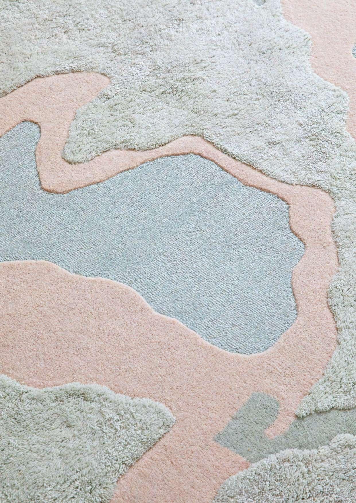 Handtufted in 100% New Zealand wool with an additional base layer of organic cotton that enhances durability and resilience. The new color scheme is more subdued than the original collection. This allows the design to take on a different role, becoming more sophisticated and mystic in its overall aesthetic.