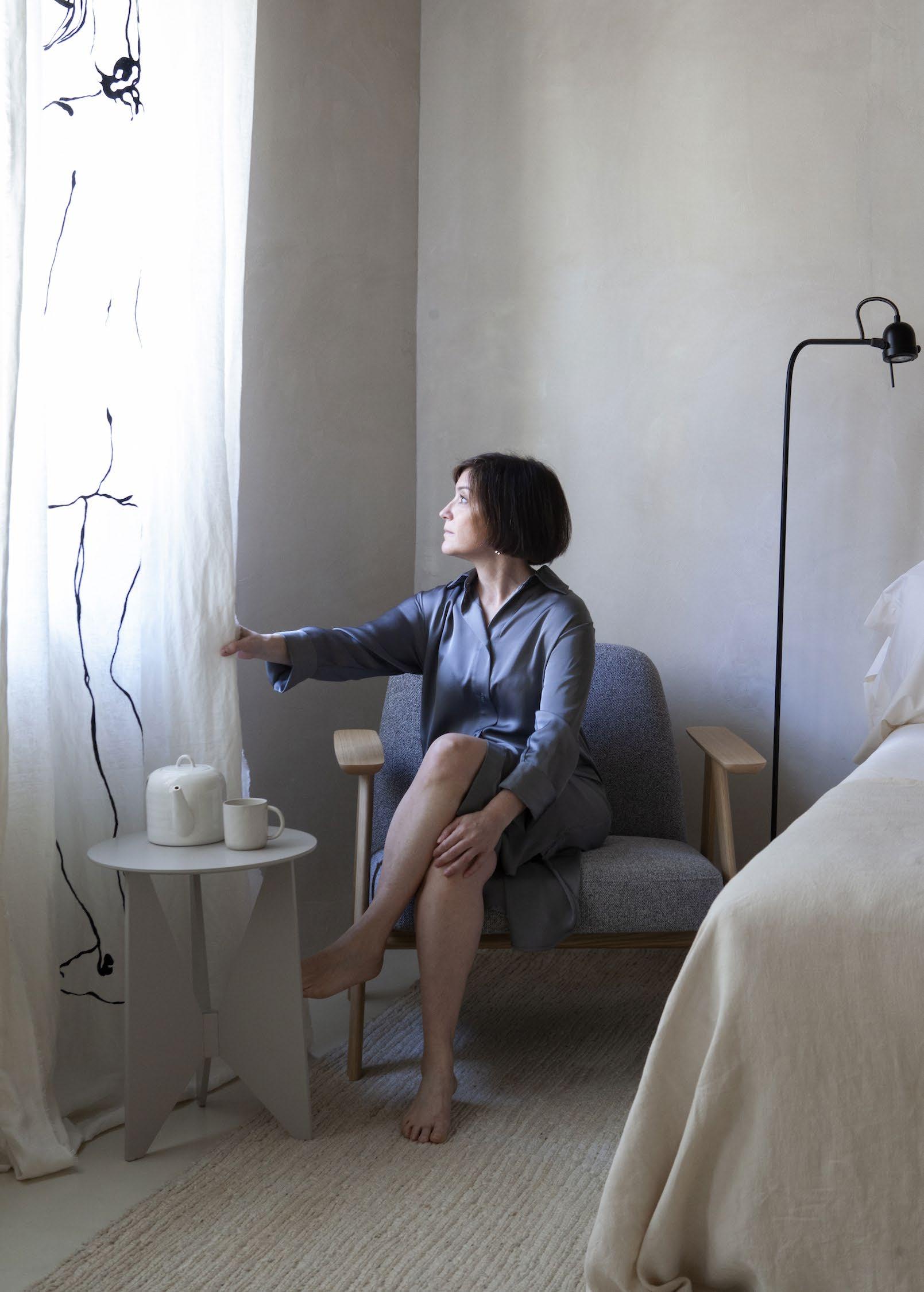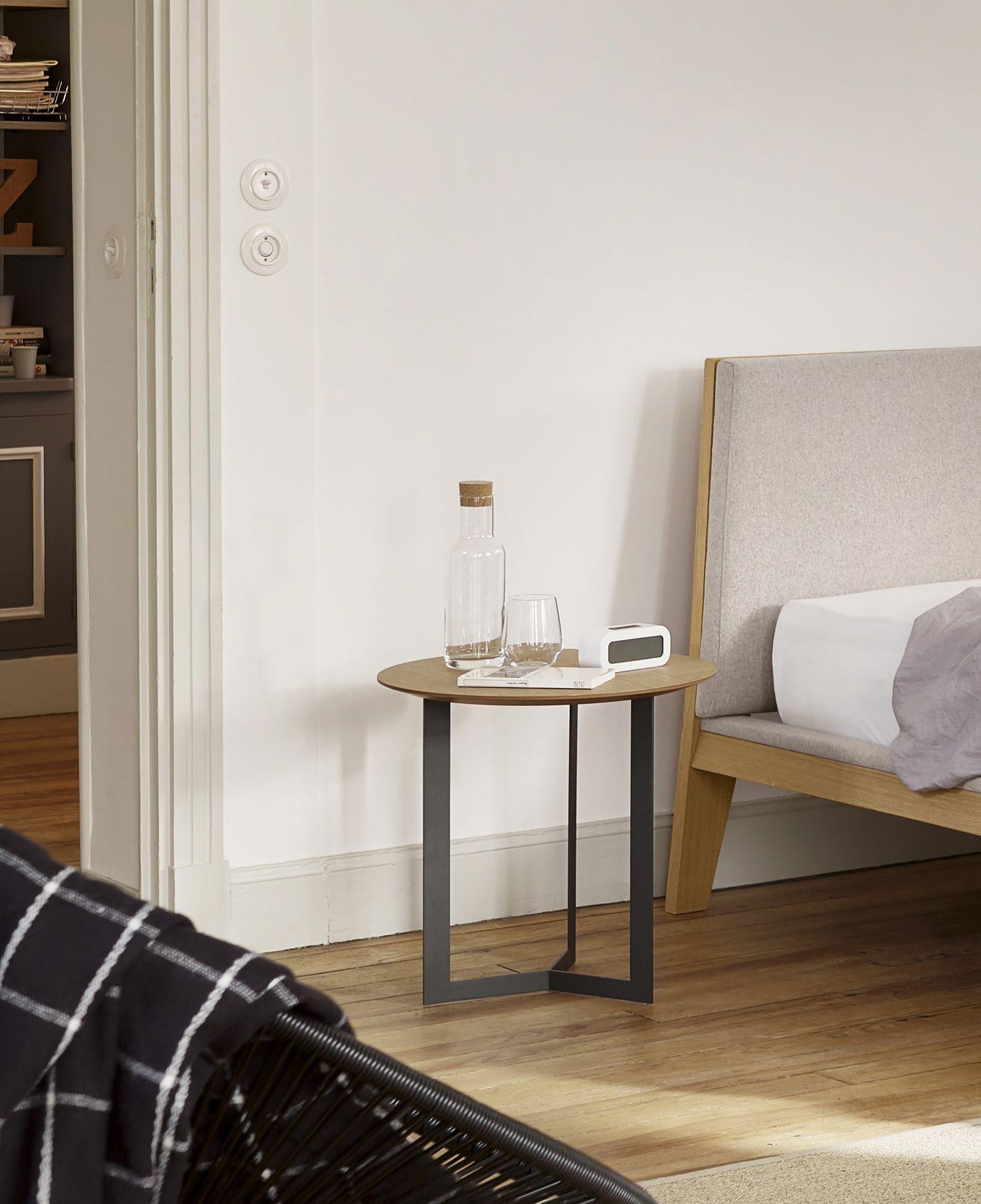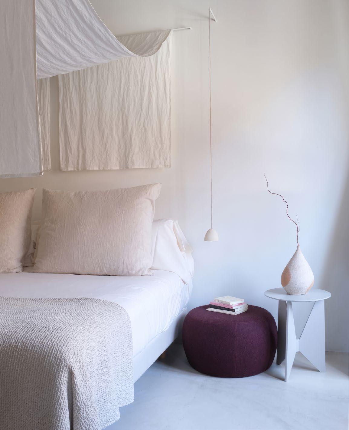 Hiru coffee table lacquered in Stone and Laika pouf next to a bed. Mesita Hiru lacada en Stone y pouf Laika junto a una cama.