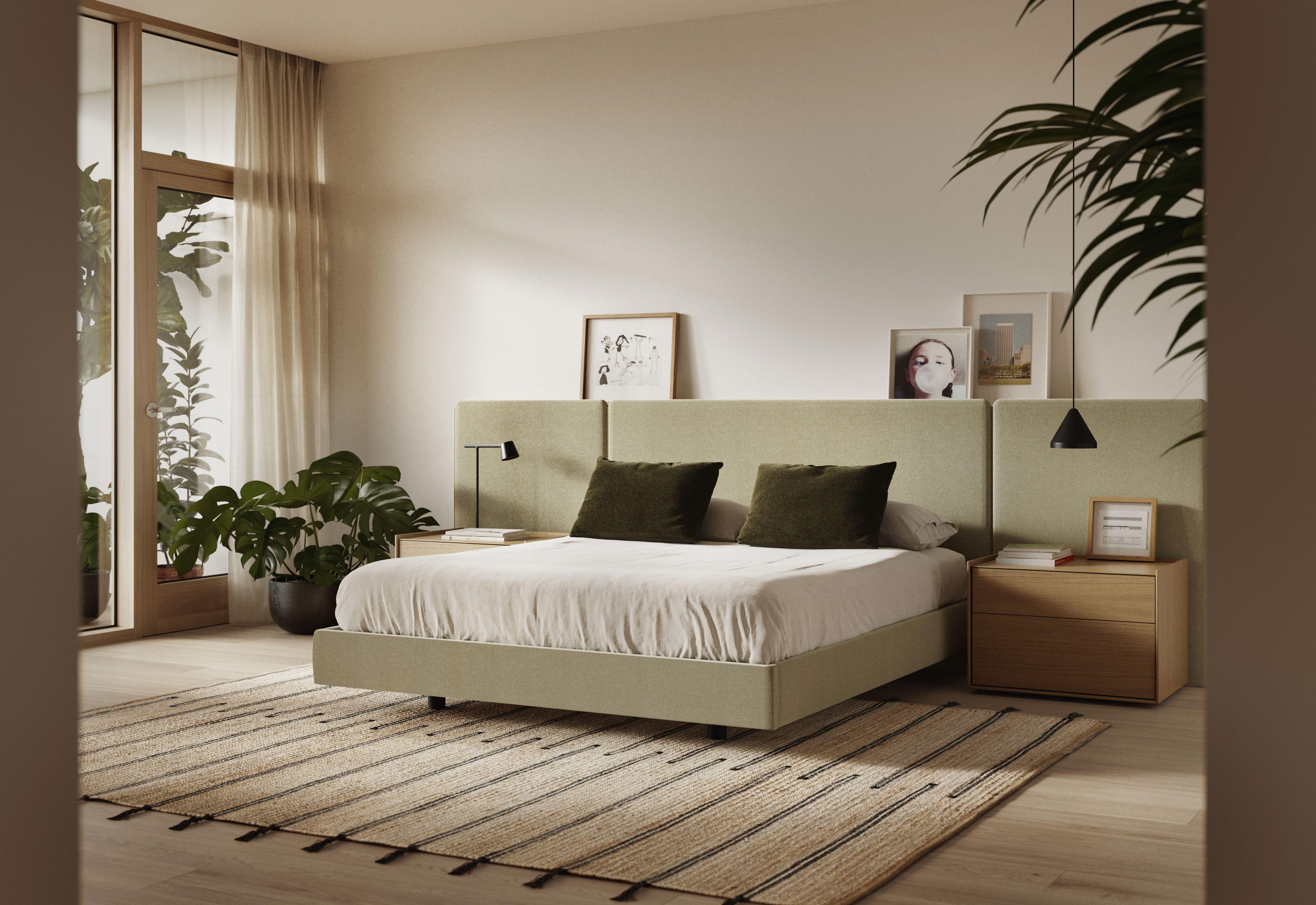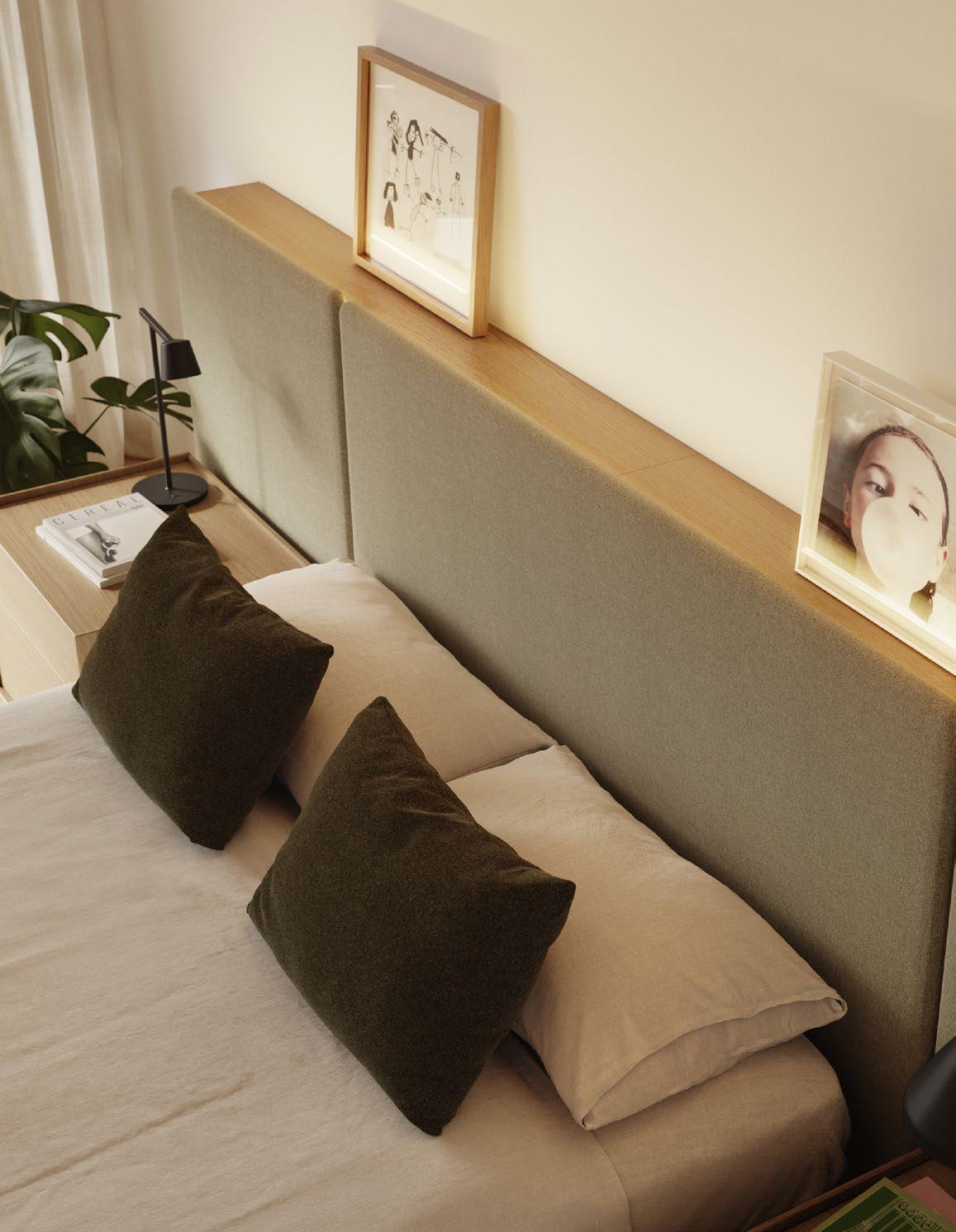 Lota headboard and frame upholstered with Breeze Fushion 4104 fabric. Shelves in Organic Oak. Cabecero y aro Lota tapizados con tela Breeze Fushion 4104 y estantes en Roble Organic.