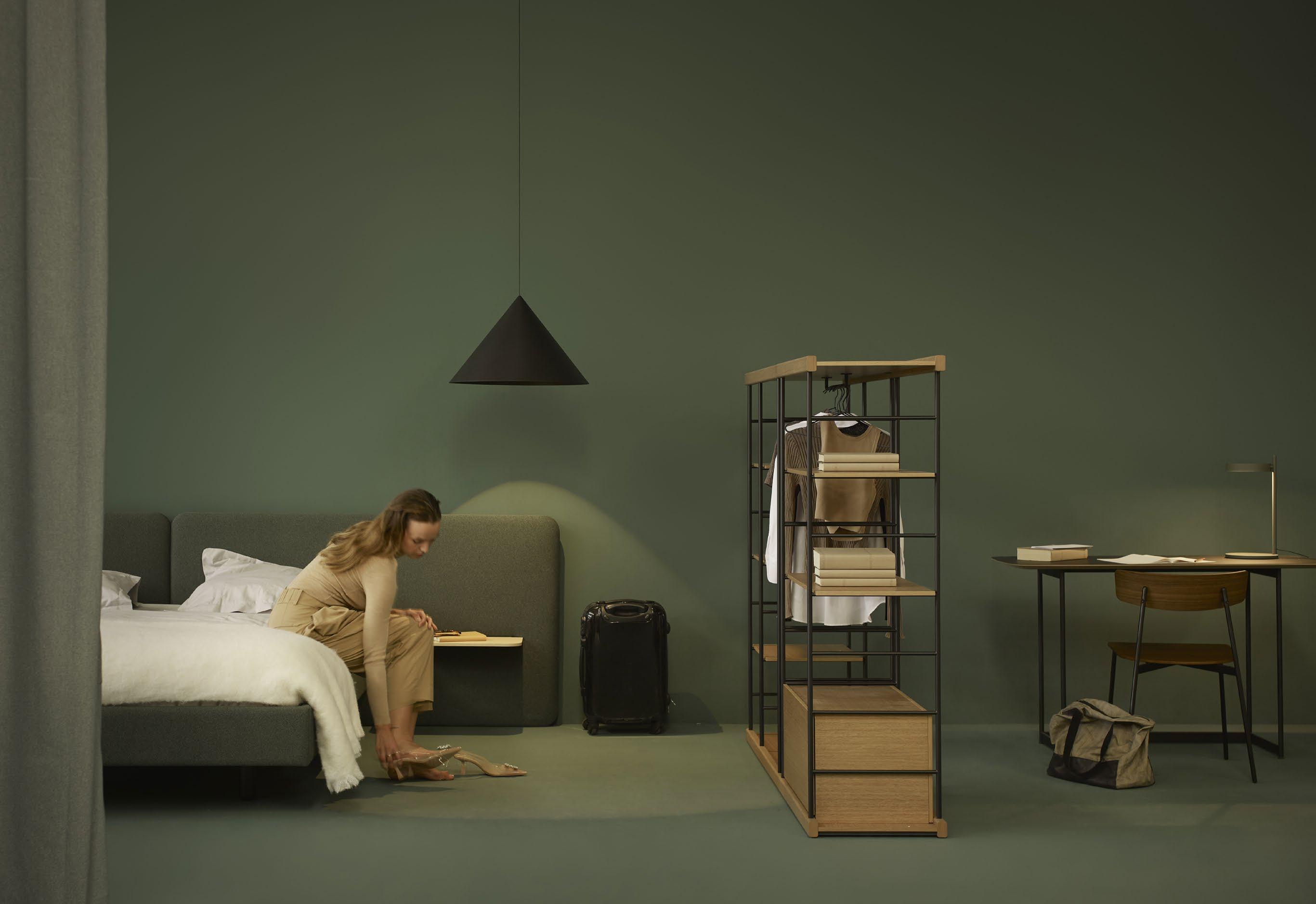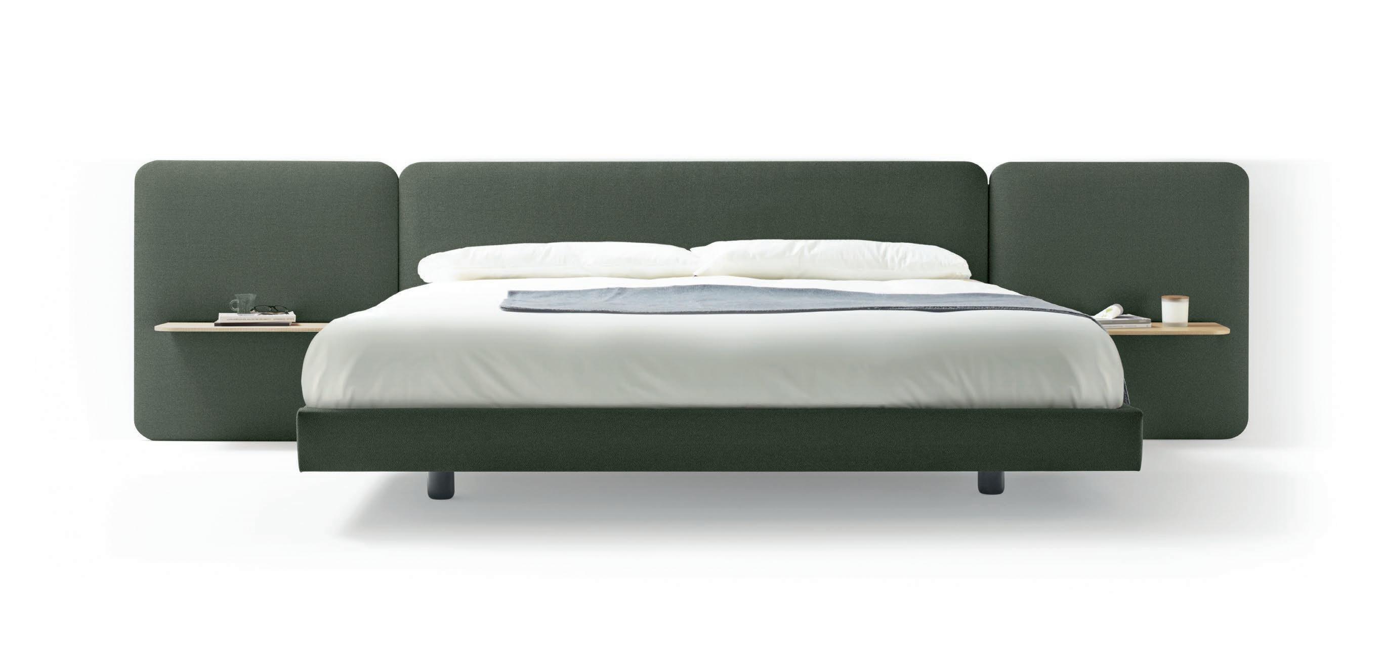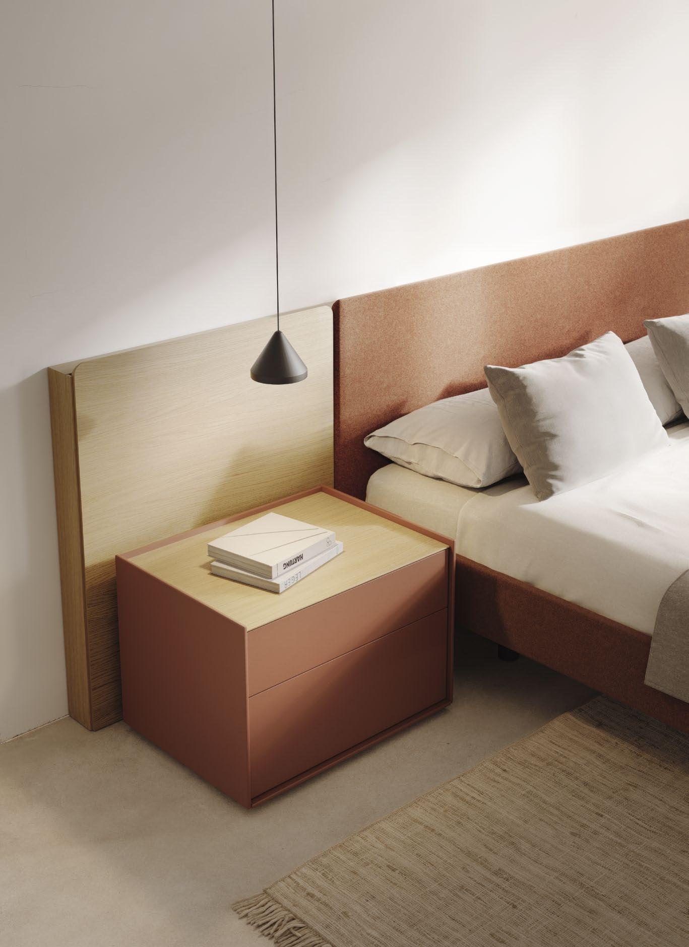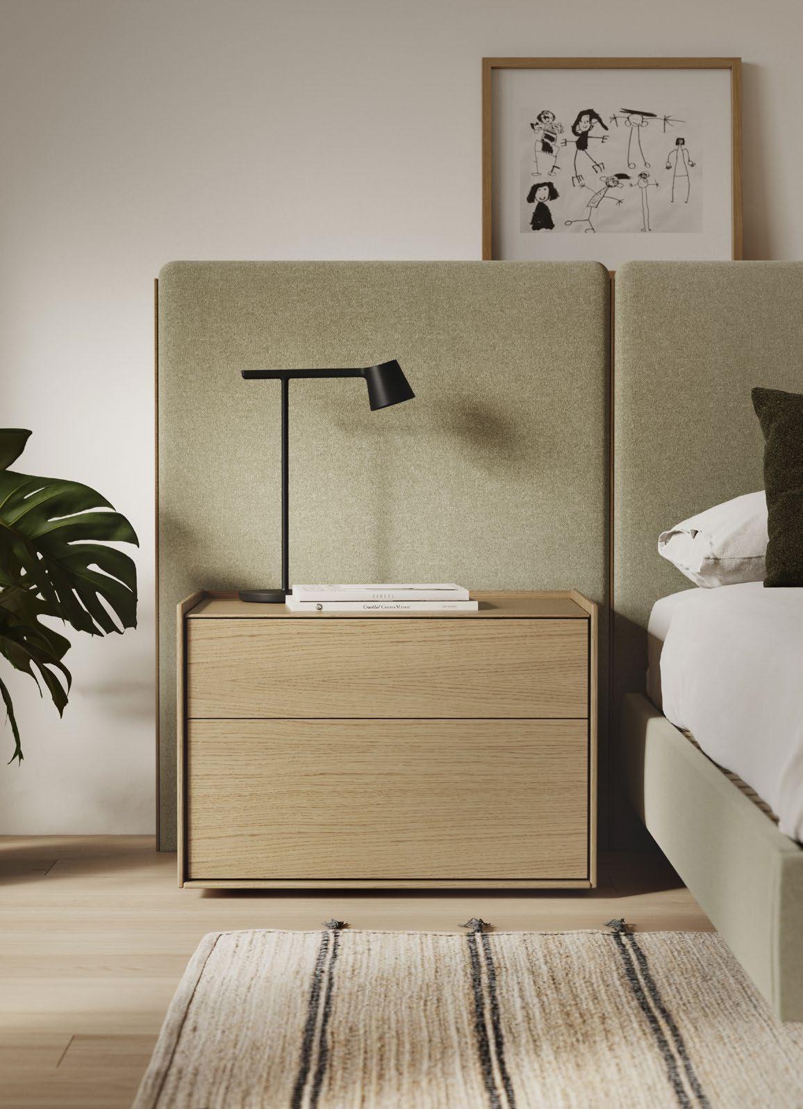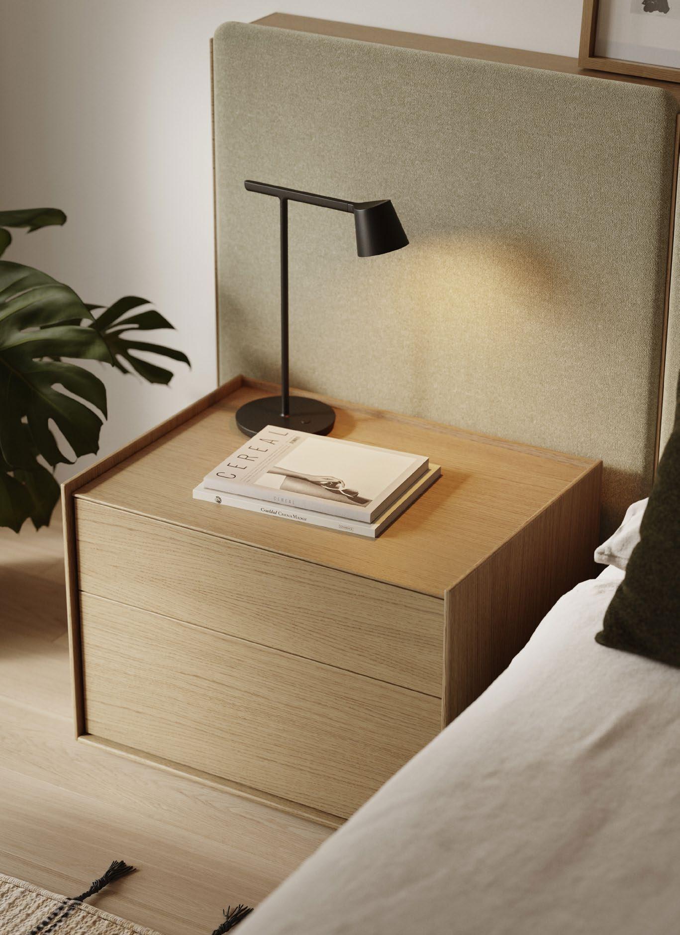 Rounded panels with different widths and heights, combinations of fabrics in different colours, floating shelves and bedside tables with drawers: add your personal touch to your bedroom with the Lota collection.