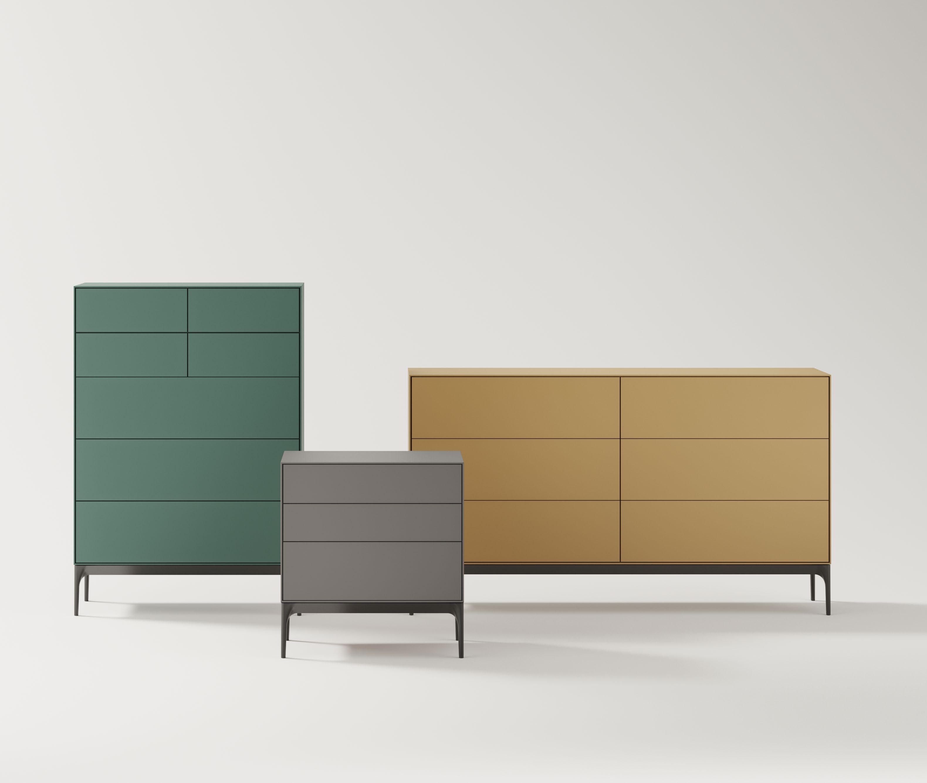 Lauki collection bedside table lacquered in Mink, dresser lacquered in Ochre, and chiffonnier finished in Forest, all of them on metal legs.