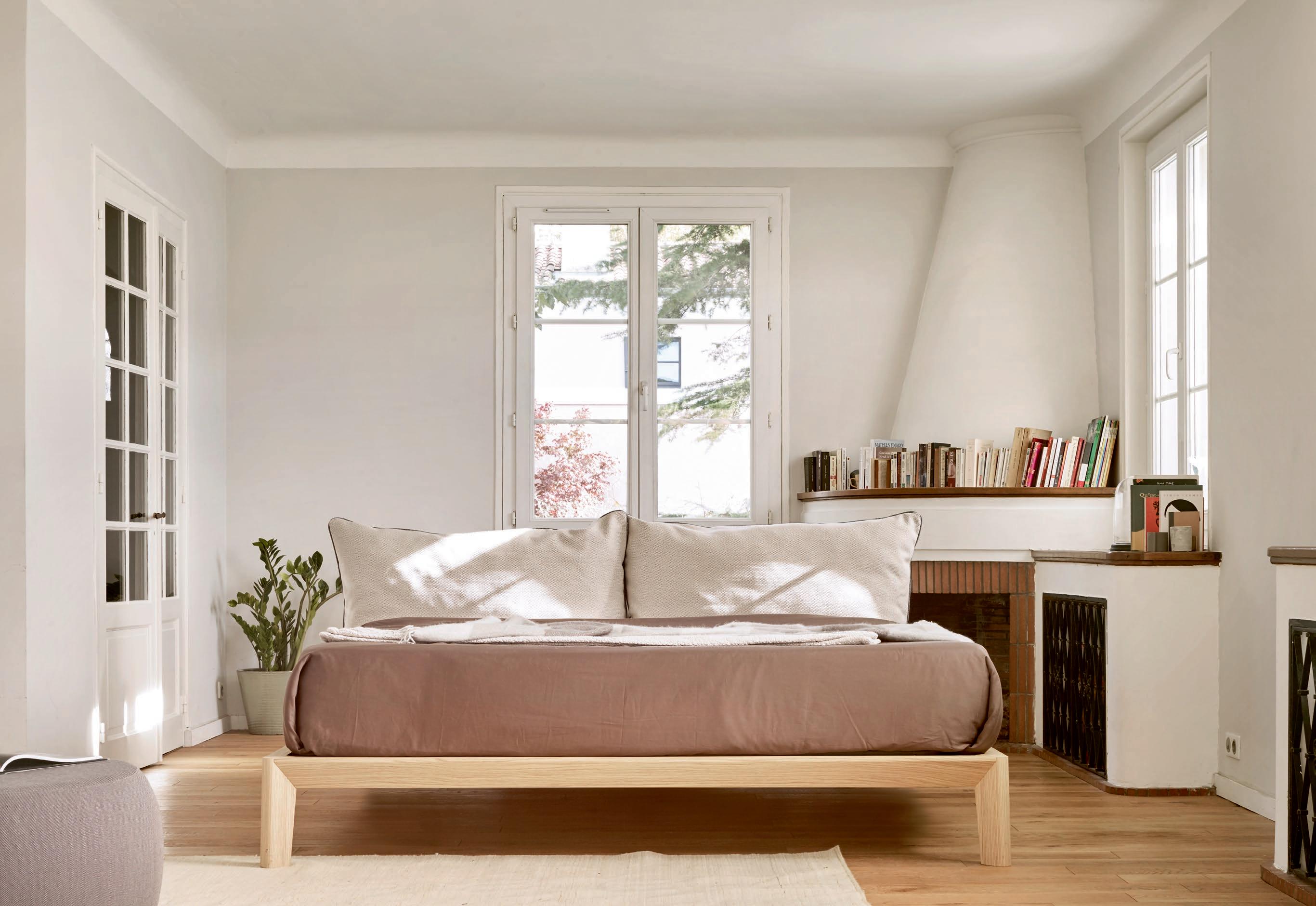 Cama Bora en roble organic con cojines Lopi en tono Sand.