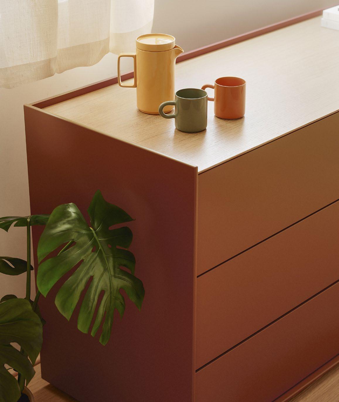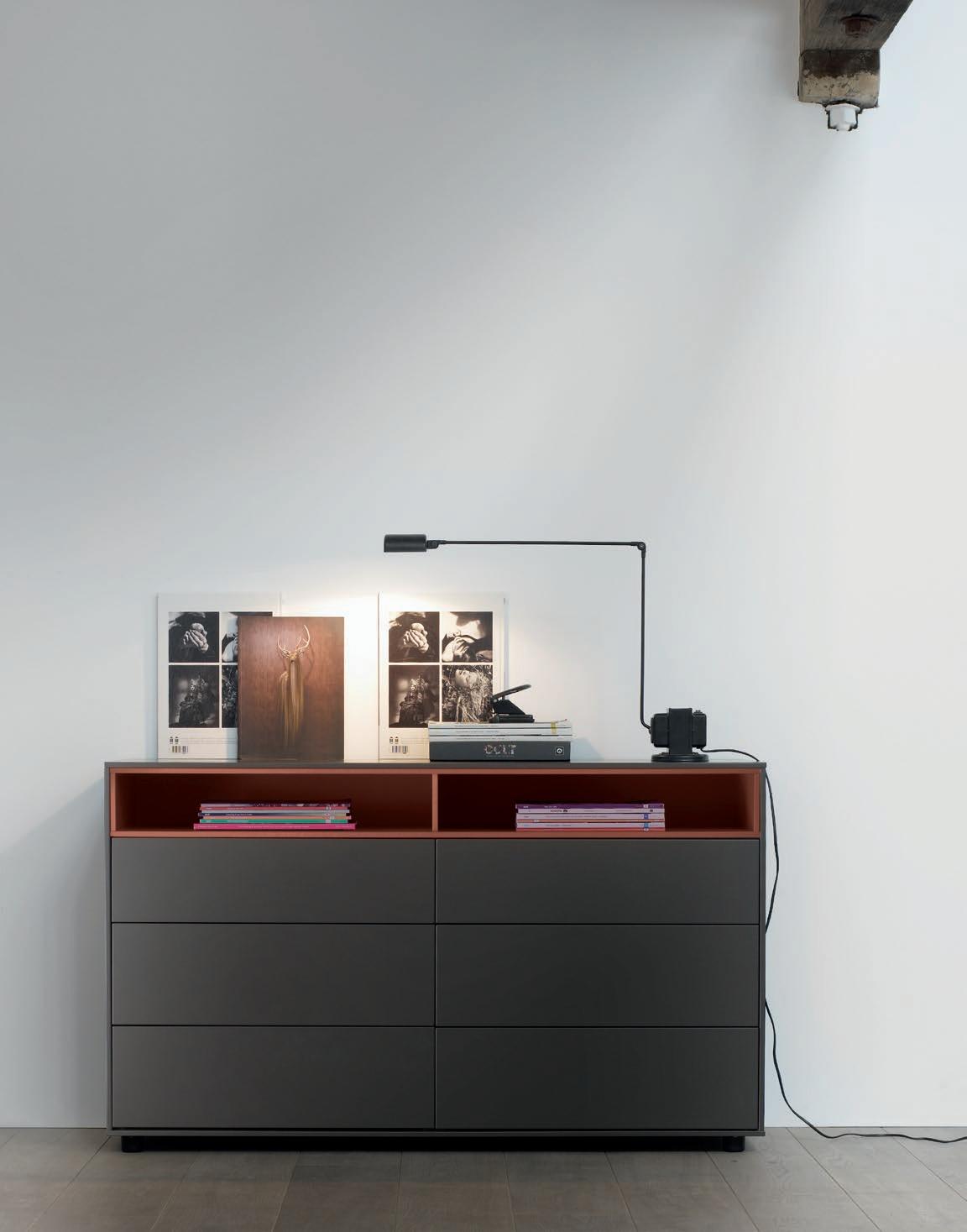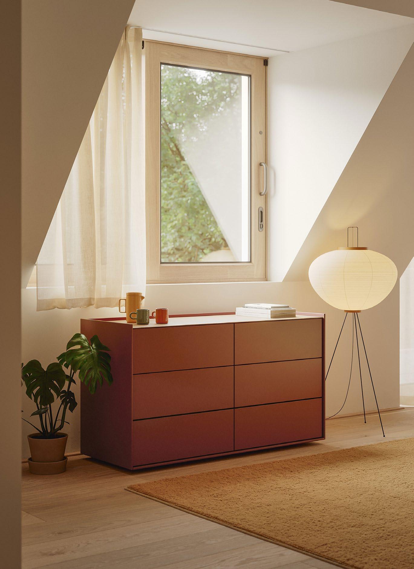 Lauki is a unique range of sideboards and bedside tables, where endless configurations in terms of sizes, shapes and finishes can be arranged. The elements that identify the collection are the 0.5 cm profile that surrounds the perimeter of the cabinet and the pushto-open system in the drawers. The range blends perfectly with any of the Treku lounges or bedrooms. In terms of finishes, they are produced in all Treku lacquers and woods.