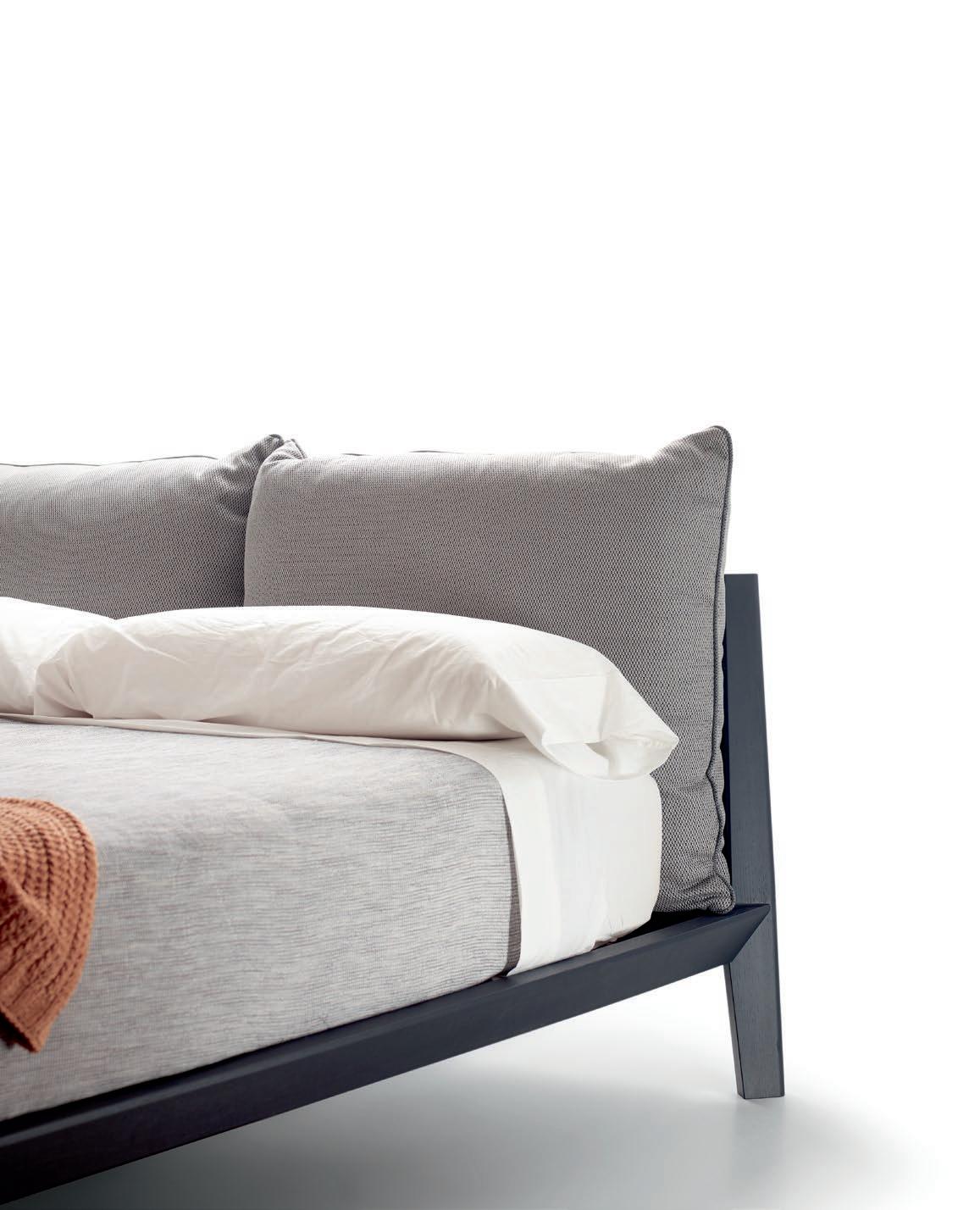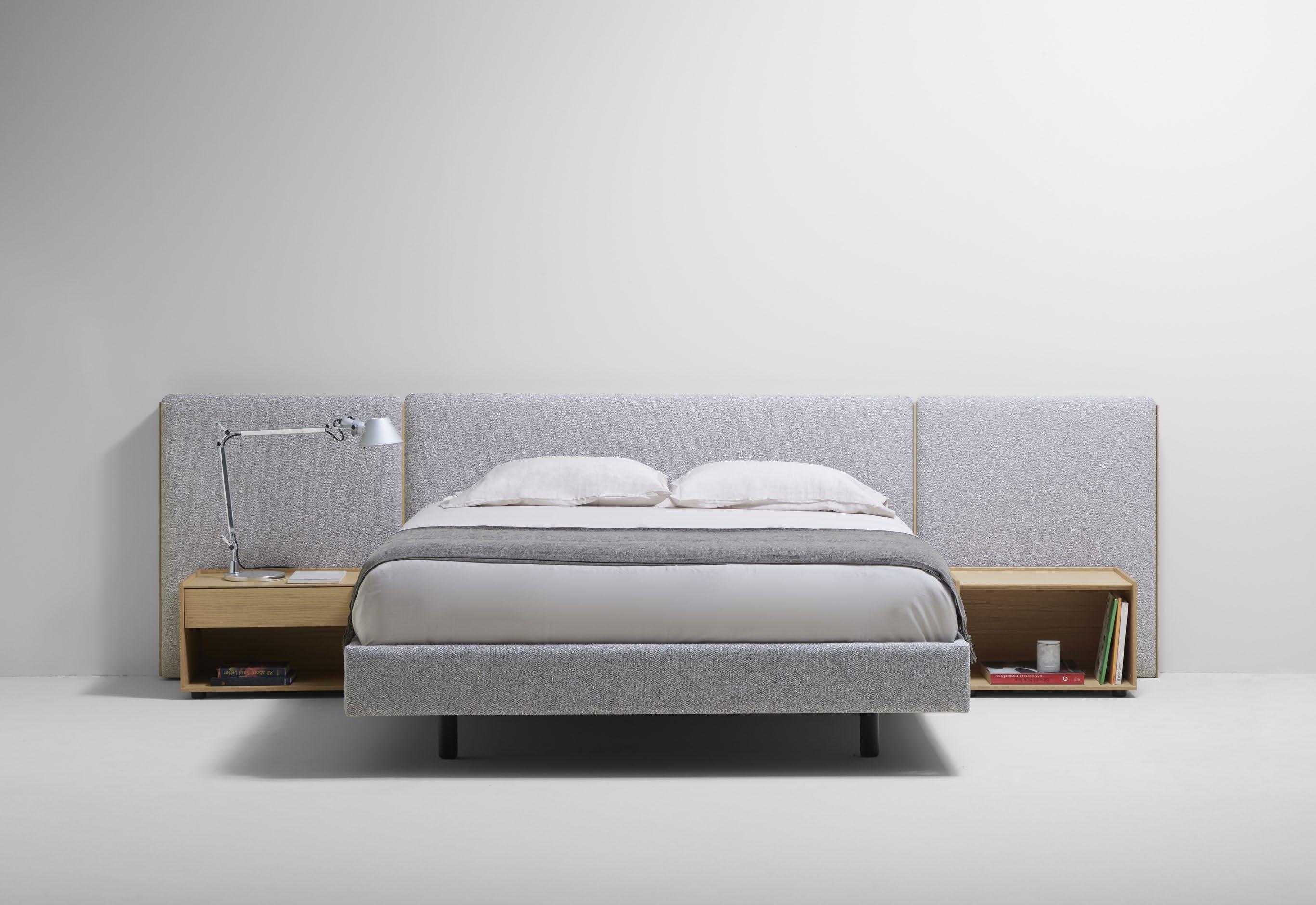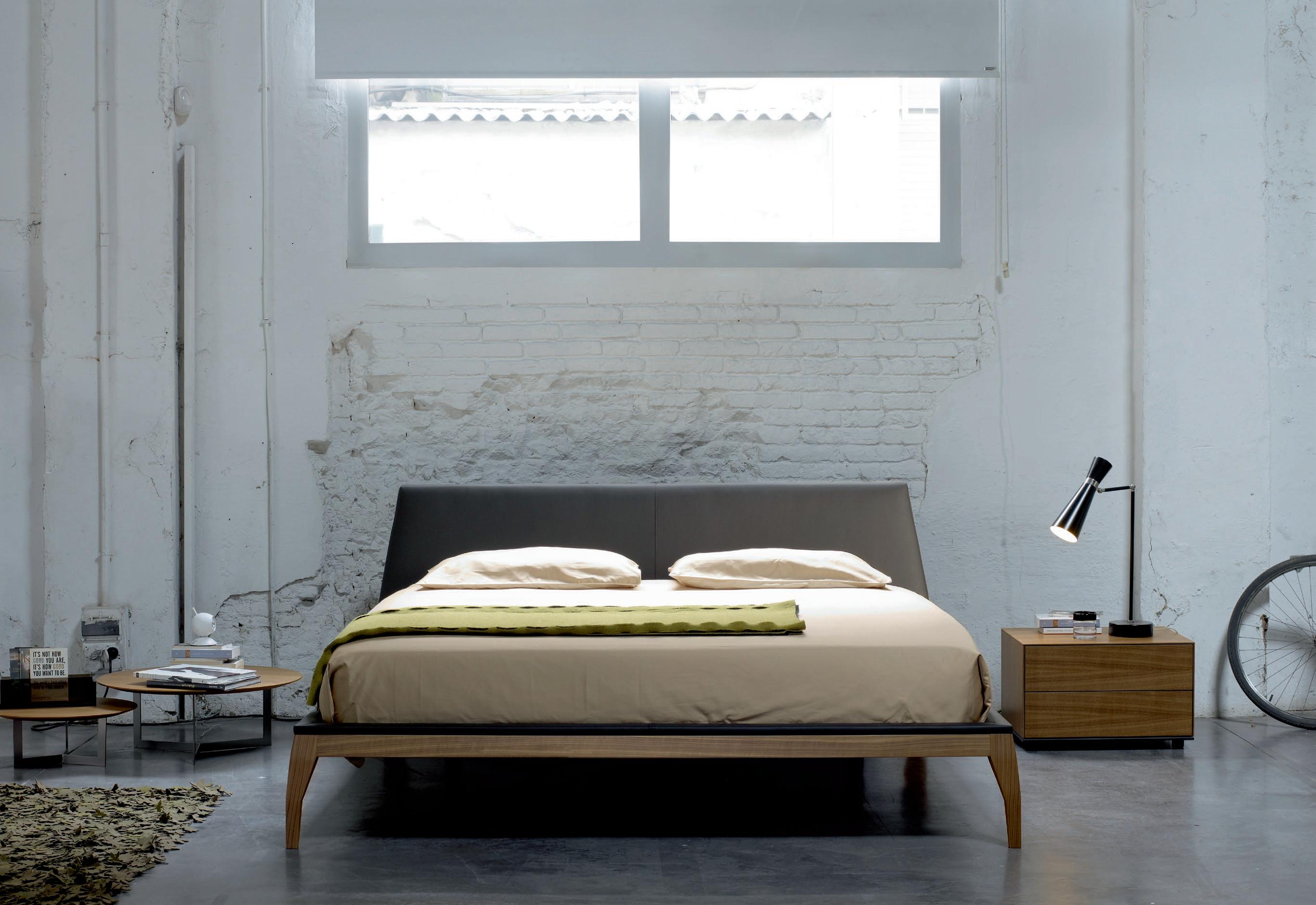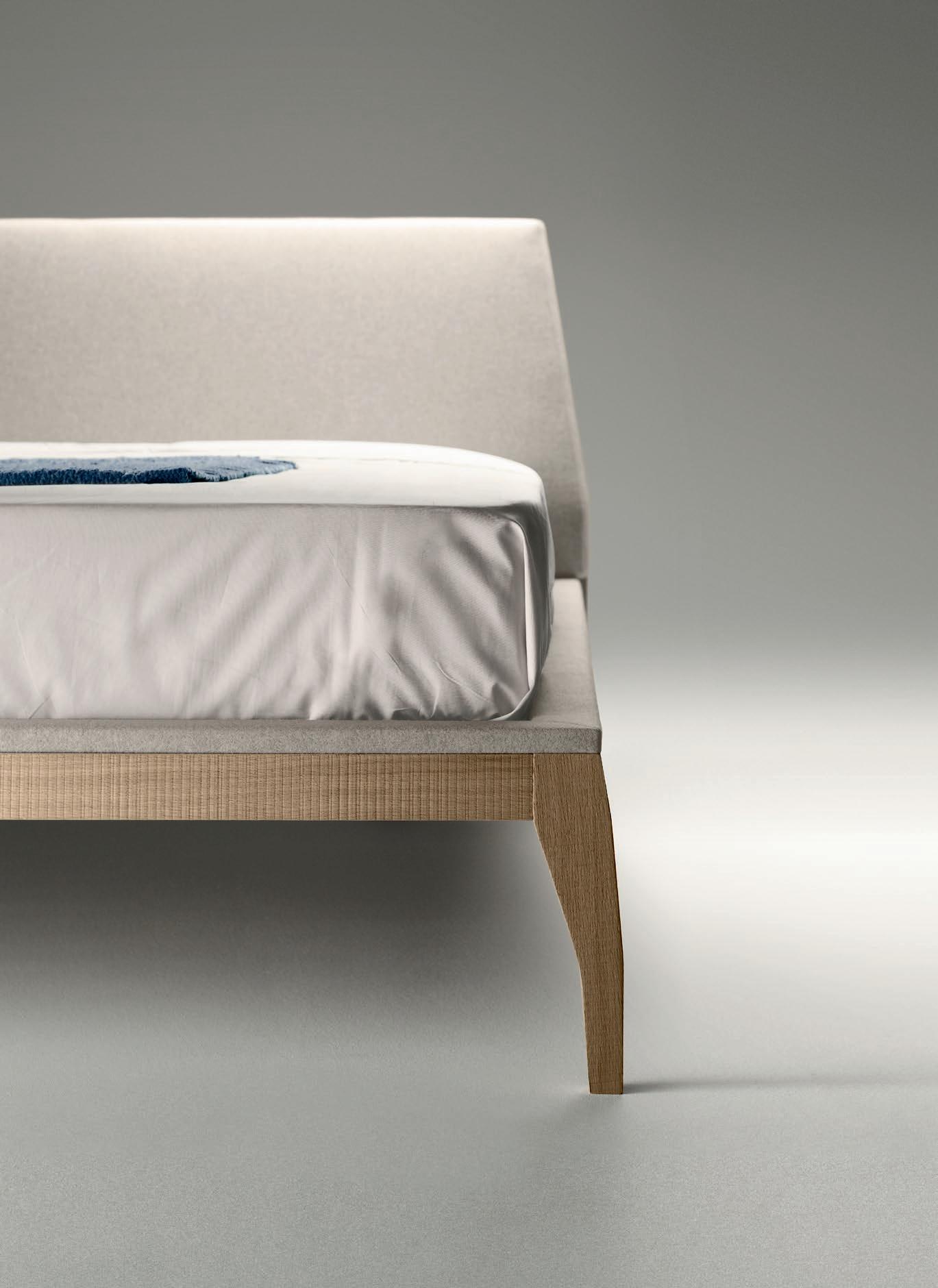 The Bel bed is a work of fine, almost sculptural carpentry. The solid wood frame provides the necessary rigidity and the padded headboard ensures a comfortable reading position. Both the headboard and the upper part of the frame can be upholstered in any of our fabrics or leathers. The model is completed with the collection of Treku bedside tables.