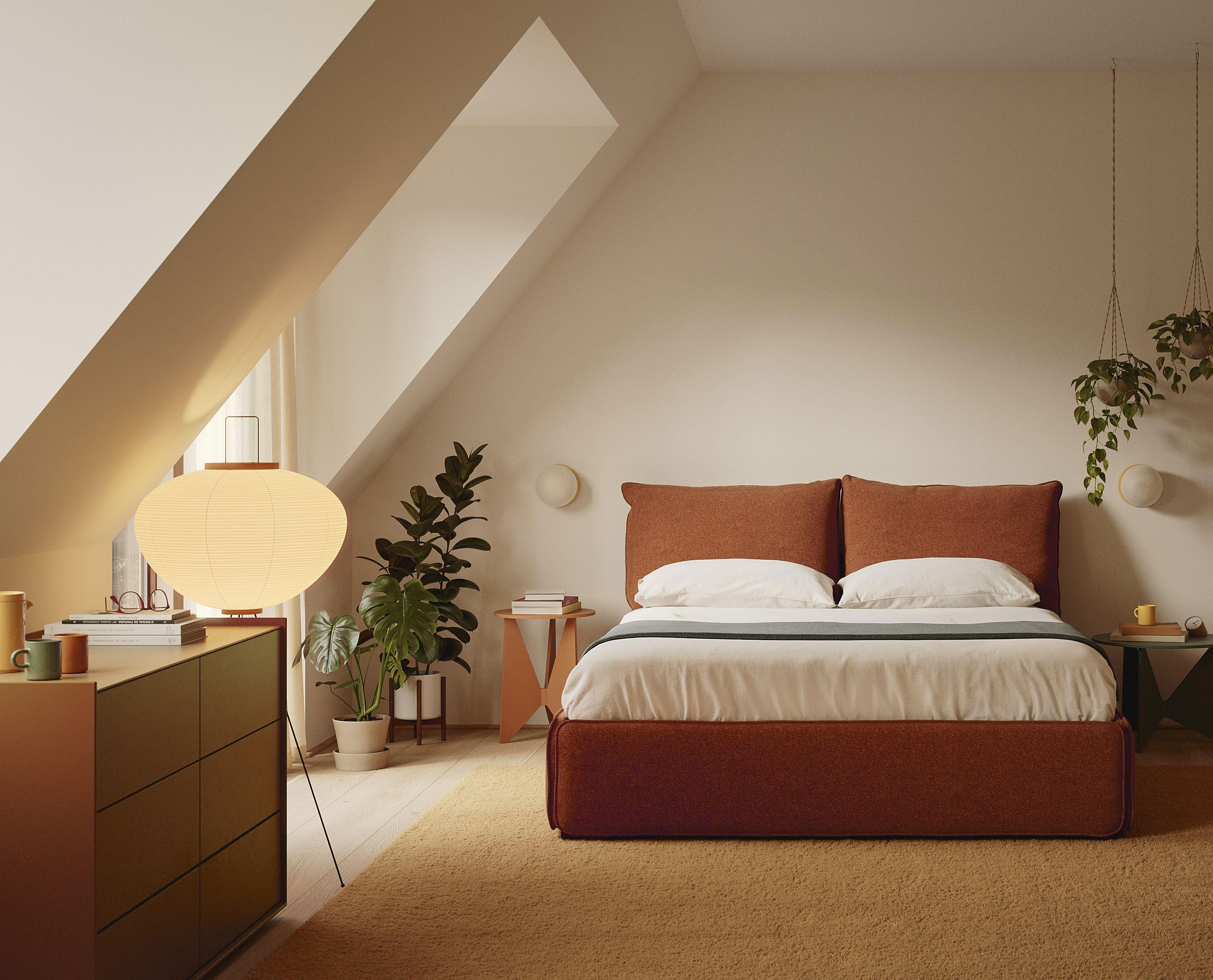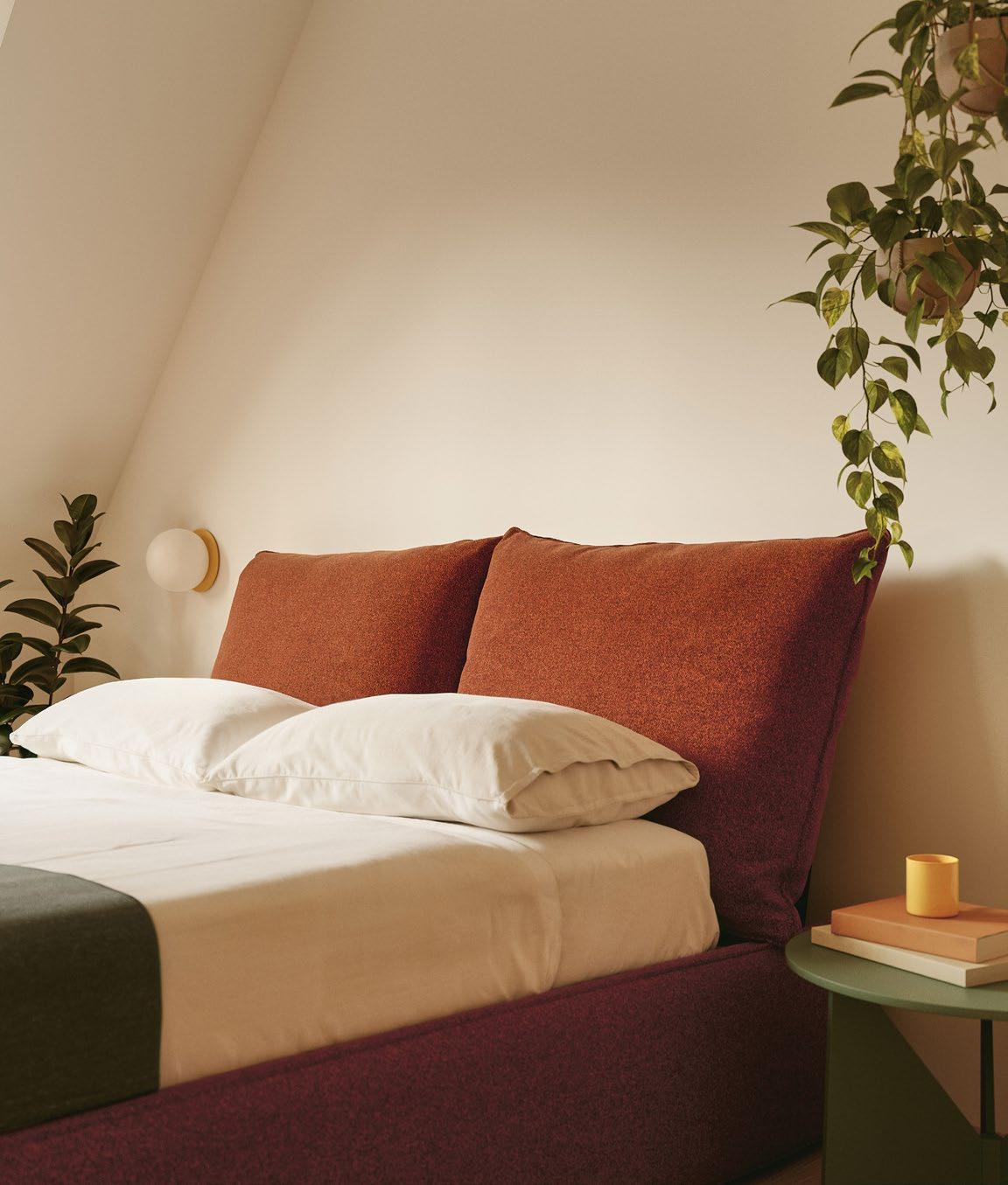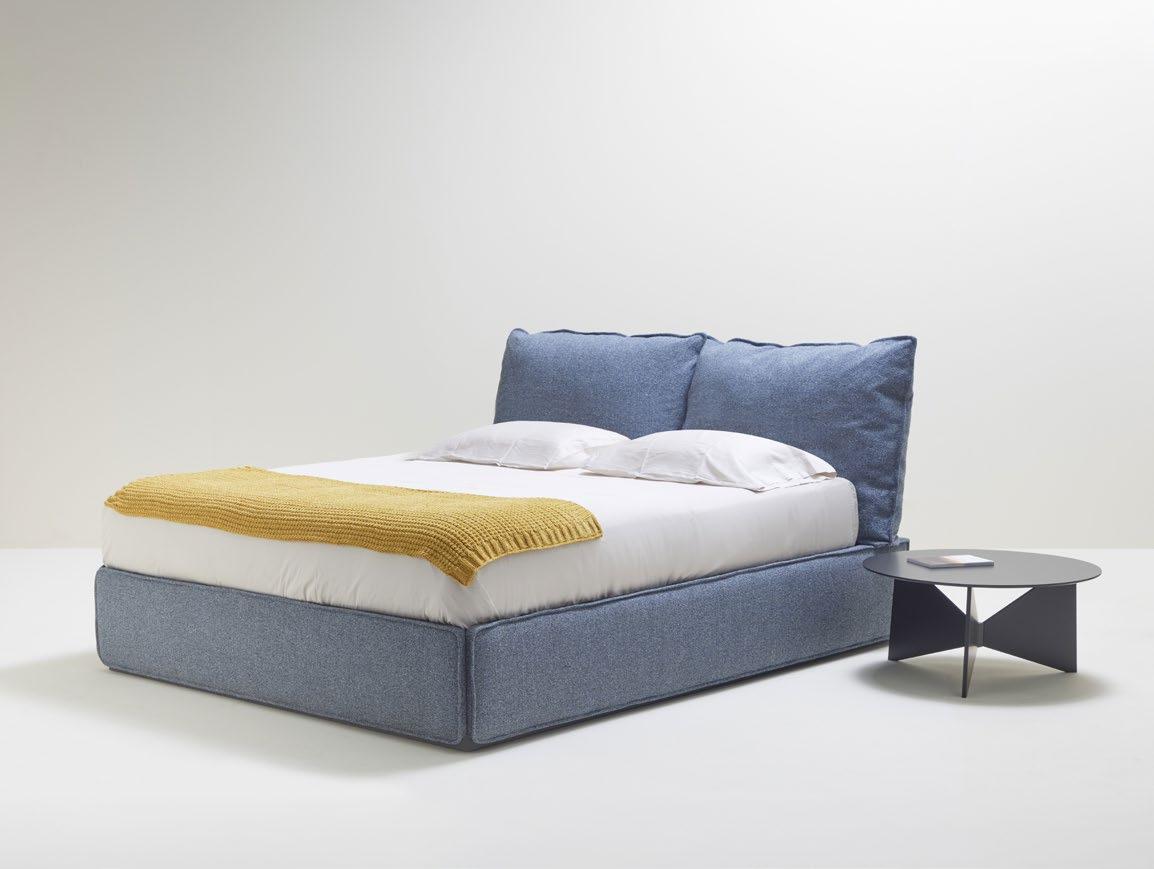 In the Gala bed, we have focused on details like the piping on the upholstered frame and cushions, avoiding straight lines and sharp angles for a softer, more comfortable feel. The bed frame can also be lifted, providing extra storage space in the bedroom.