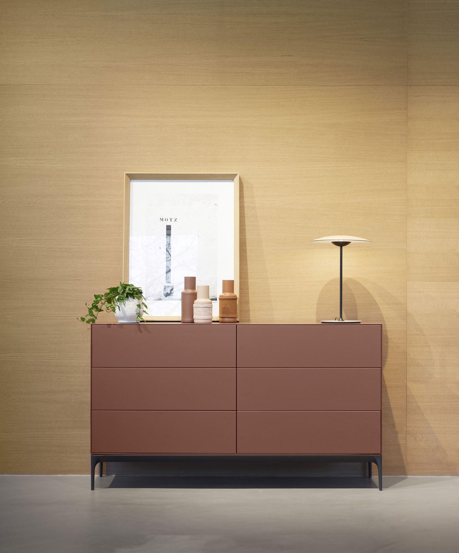 Bera dresser with structure and fronts in Brick lacquer and a top in organic oak. Cómoda Bera con estructura y frentes en lacado Brick y encimera en roble organic.