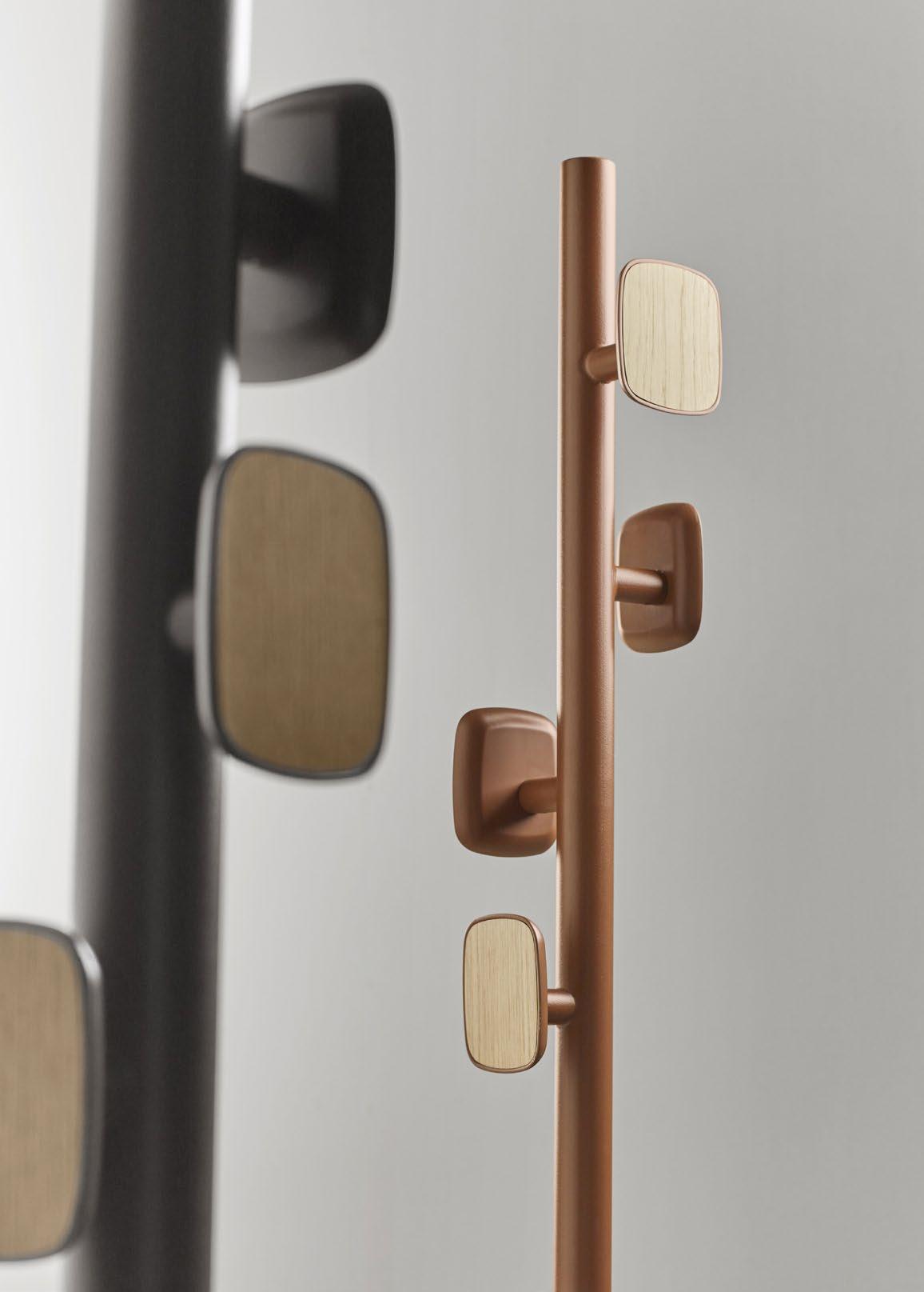 There are two versions of the rack: freestanding or wall-mounted. The hooks can be lacquered in any of our colours, and coupled with our woods and lacquers on the front of the rack, offering infinite different combinations, from serious and elegant to fun and fresh.