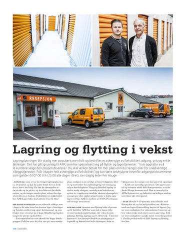 viktig prosess for mange som skal spare tid og penger. – Koble oss inn tidlig i prosessen. Det sparer mye tid og ressurser under hele flytteprosessen, er rådet André Hauge kommer med. Han er ansvarlig for APRs flytteservice, og bekrefter sin kollegas analyse som tilsier økt etterspørsel. allerede 9–10 personer som arbeider med flytting her nå, og har nylig etablert oss i Kristiansand med egen flytteavdeling knyttet til lageret. Jeg ser store muligheter for virksomheten fremover, og tror vi kan tenke enda større enn vi gjør i dag. Folk ser store muligheter og ikke minst ressursbesparelser i å bruke profesjonelle til både lagring og flytting, sier han. – VI ER