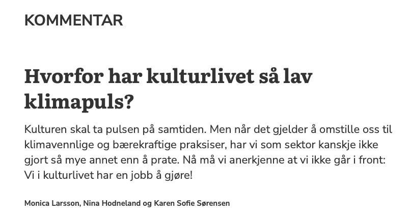 Sammen med Virke, Norske Kulturarrangører, Norsk teater- og orkesterforening og CREO fikk vi også for første gang kartlagt faktiske utslipp fra kultursektoren (tall fra 2022) og samtidig vise til arrangører og prosjekter som gjennom året aktivt arbeider med å redusere sitt karbonavtrykk. Vi ser frem til veien videre med våre samarbeidspartnere!