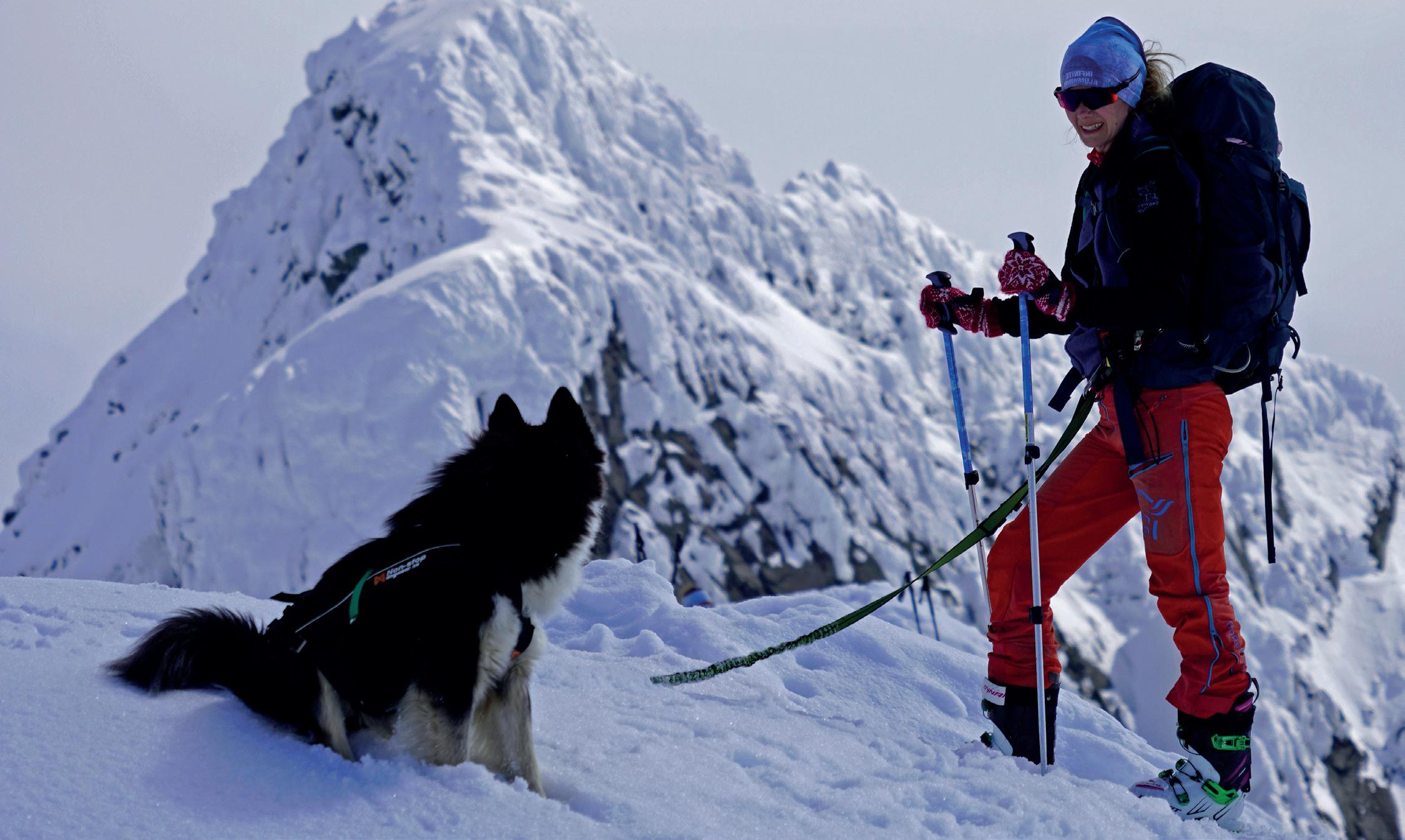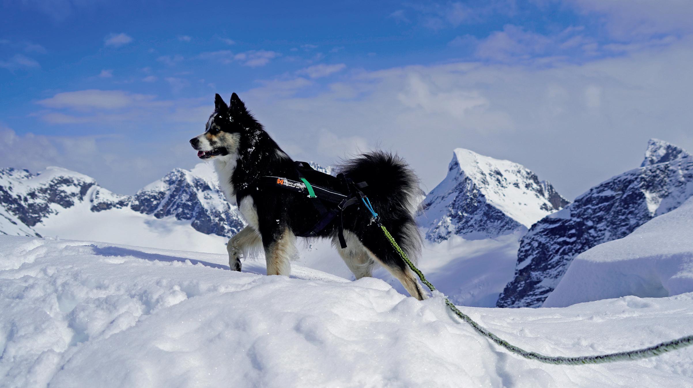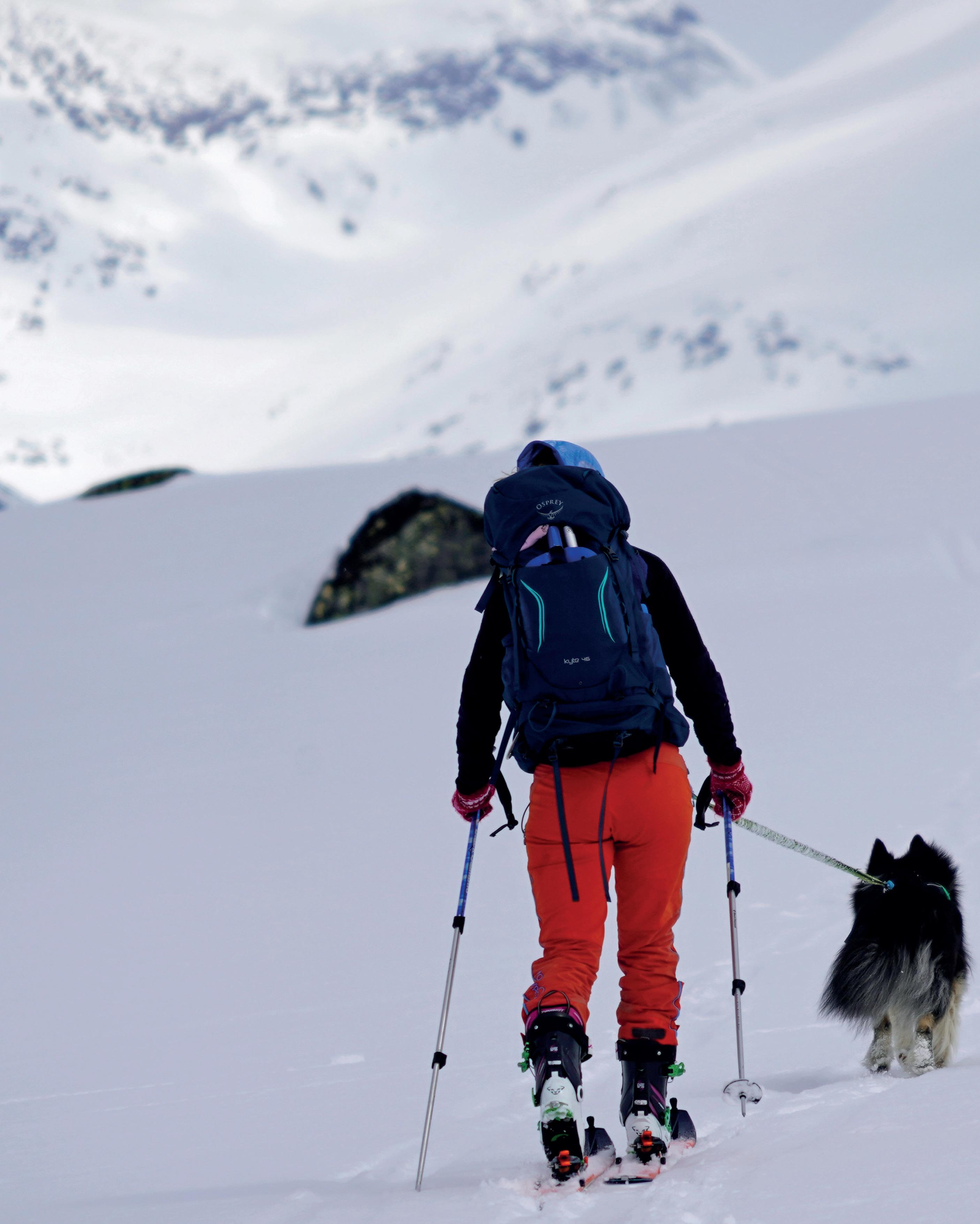 Det er ein nydeleg dag med 3-4 minusgrader og sol frå blå himmel. Føniks jobbar på framfor meg, og saman traskar me oppover vestryggen på Austanbotntindane, berre omringa av snø og tindar så langt auga rekk. Dette er livet. Det er både hund og menneske einige om. Og det at denne hunden er så flink i fjellet, gjer han til ein perfekt turkompis. Som fjellhund er han sjølvstendig og modig, på same tid som han er lojal og sterk. Han gir ikkje opp med det første. Me nærmar oss etter kvart fortoppen til Vestre Austanbotntind, og her set eg frå meg skia. Det er nydelege forhold, så me