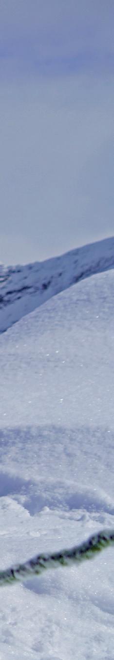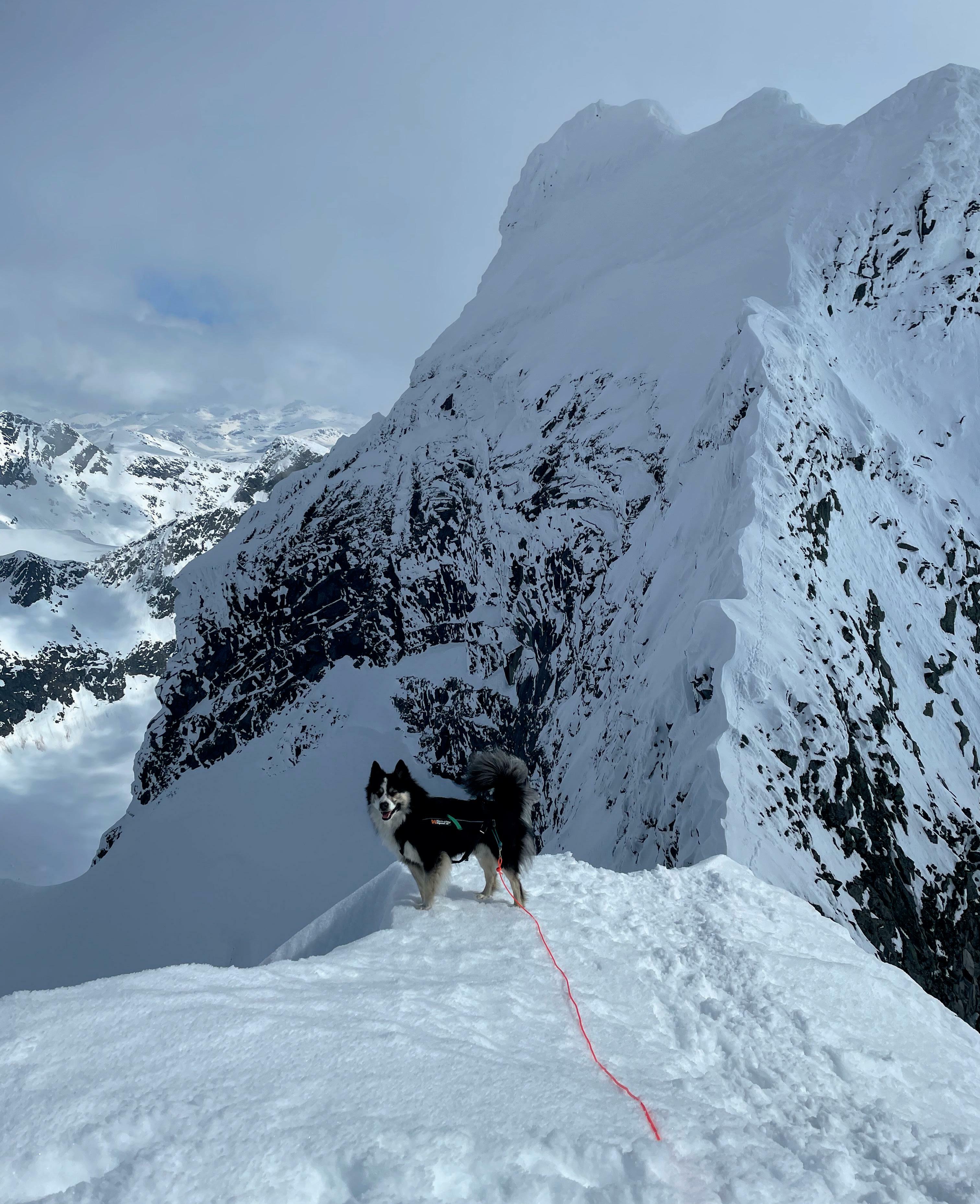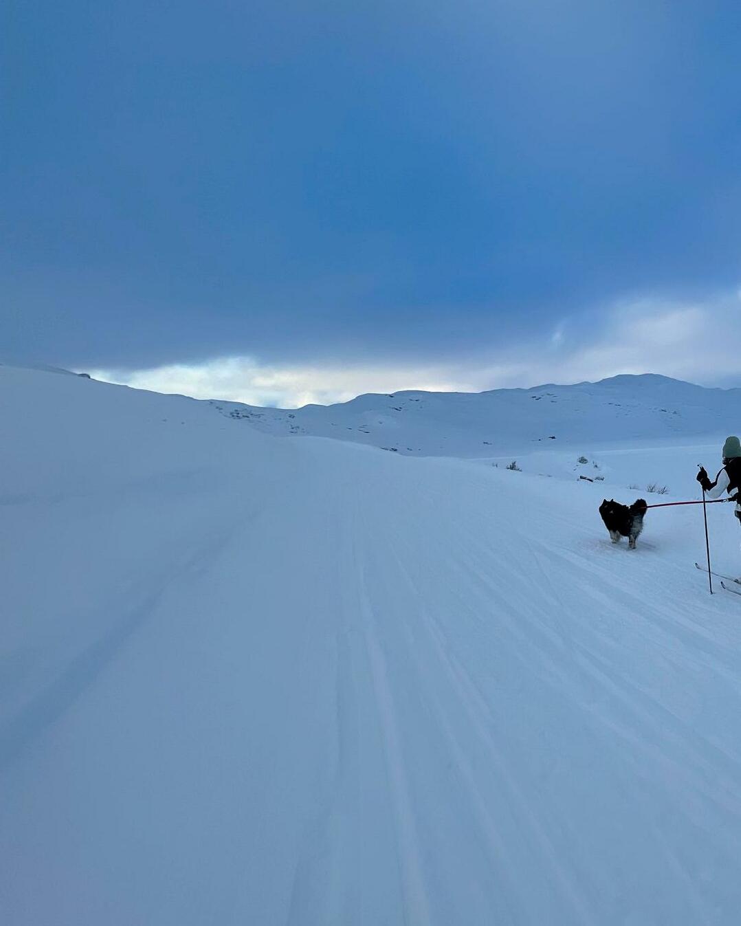 held fram mot toppen for å få full utteljing for denne nydelege dagen i fjellet. Føniks er i sitt rette element, og det einaste eg uroar meg for her oppe, er at den manglande respekten han har for bratt terreng ein dag vil straffa seg. Fleire parti på denne ryggen er både smale og eksponerte, så eg let bandet hans vera på. Han elskar utsiktspunkt, og kan stå lenge og sjå utover landskapet. På toppen er me oppe i 2100 moh, og i dag er det ikkje eit vindpust i lufta. Livet der nede i låglandet blir så fjernt, og Føniks rullar seg i snøen og ser lukkeleg ut han også. Det er verkeleg eit privilegium å få dela slike