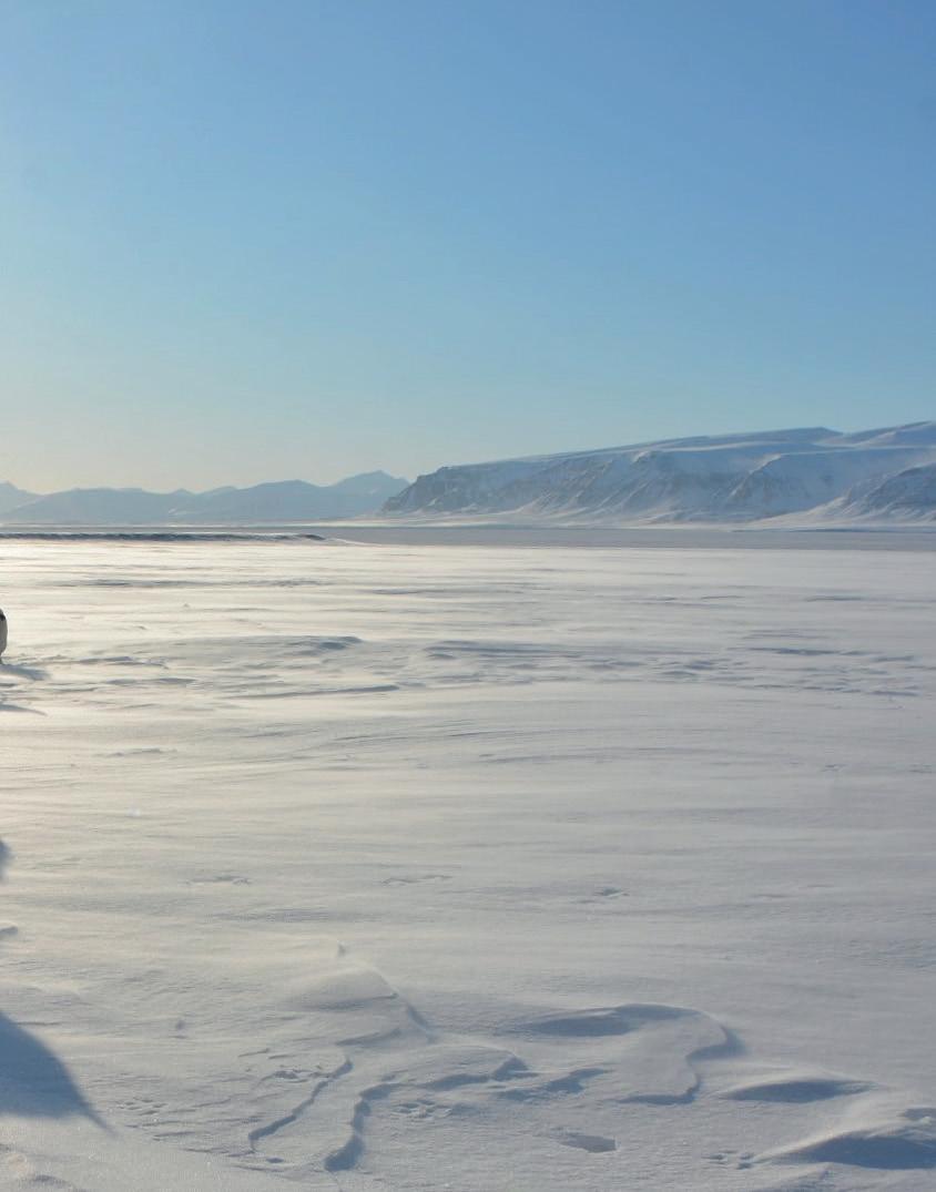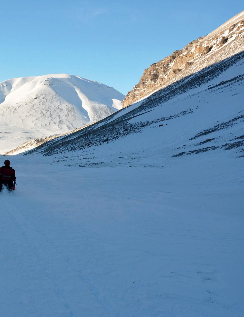 fjorden mot oss. Dicksonfjorden er et slående vakkert område, men det er ingen skutere på isen i dag heller. Vi nyter utsikten så godt vi kan, men er temmelig skuffet likevel når vi går ned til teltet igjen. Vi får omsider kontakt på satellittelefonen og får avtalt tidspunkt og sted for overlevering av depotet. Vi må kjøre ham i møte for dagene med vind har herjet stygt med snøen og skuterne kommer ikke over fjellpasset mellom de to store dalene. Han bedyrer dog at det skal gå greit for oss å ta oss opp til ham med hundesleden. Vi er litt betenkte for hvordan vi skal ta oss frem med hundeslede når det ikke er kjørbart med skuter, men vi må prøve vårt beste. Lavtrykkene ligger i kø ute i havet så vi kan ikke vente lenger nå. Det skal blåse oppå på nytt i ettermiddag, stilne av igjen