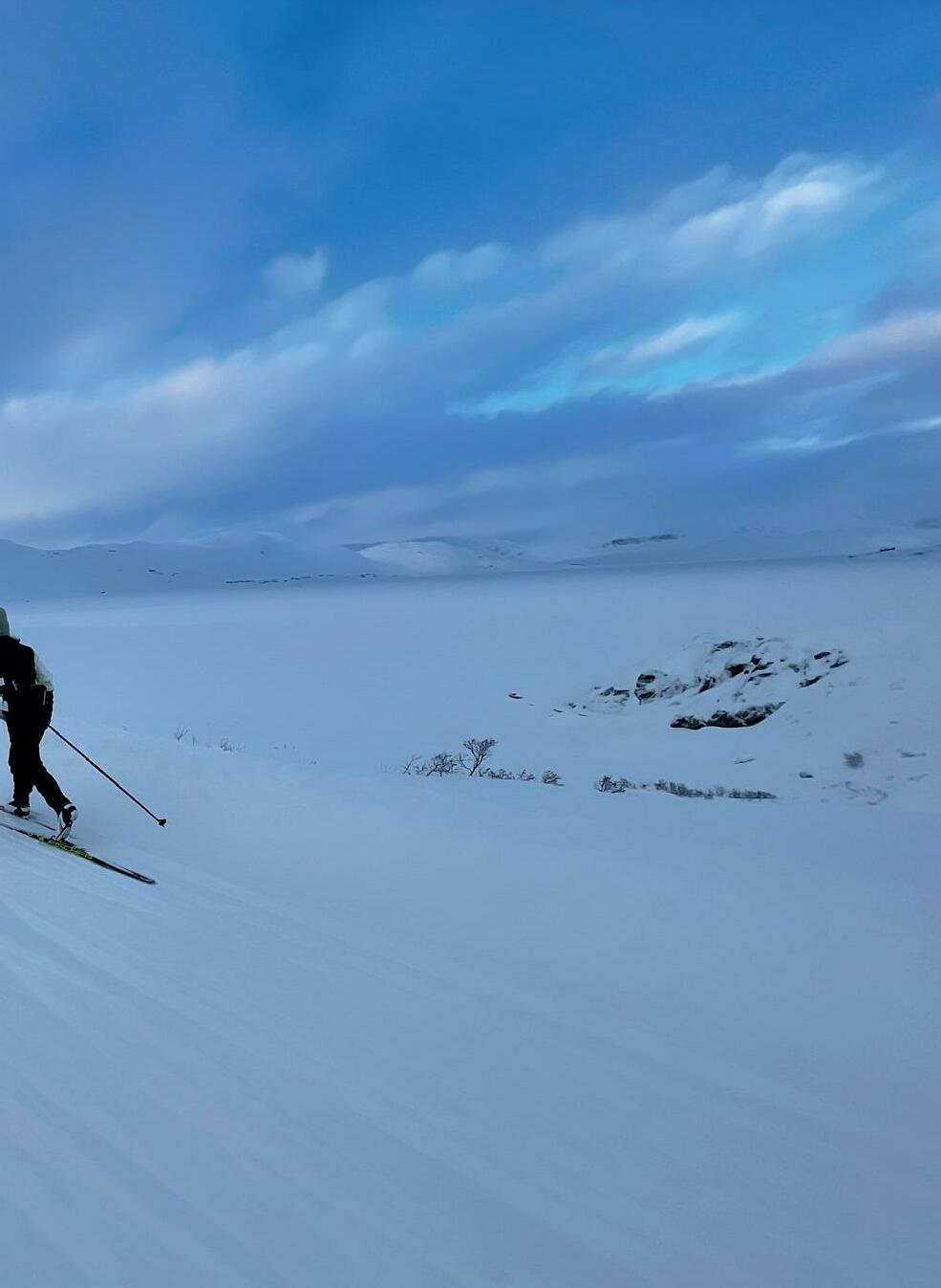 Me returnerer til staden eg la frå meg skia, og Føniks har no store vanskar med å handtera forventningane sine. Ofte må eg knyta han fast litt unna meg, for å få vera i fred når eg skal ta av skifellene og gjera meg klar for nedkøyringa. Og som ved bilen kjenner han rekkefølgja på ting, og i det bindingane låser hælane mine fast med eit klikk, så er det berre å lata det stå til. For då har ikkje Føniks tenkt å venta eit sekund lenger! Og eg blir like imponert kvar einaste gong over kor stor fart han klarar å halda i laussnøen.