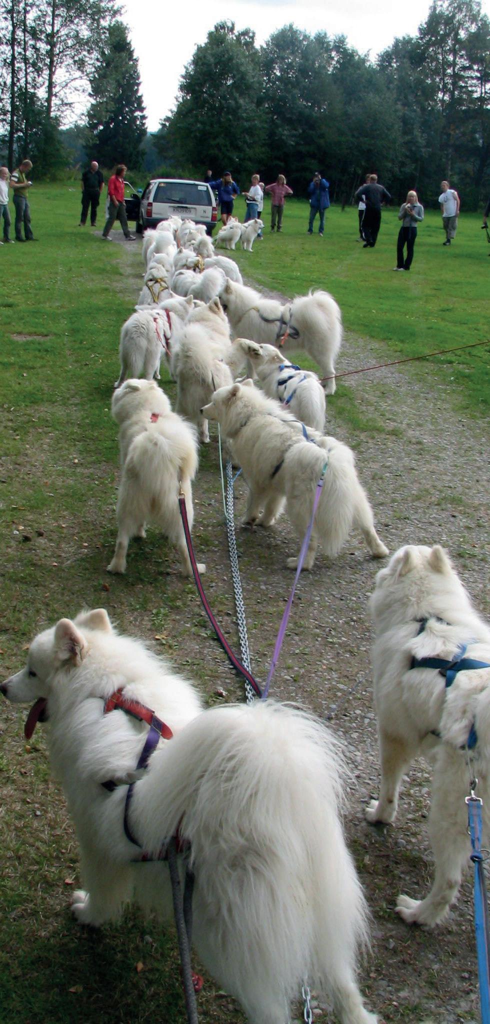vis ikke er motsetning mellom disse to aktivitetene viste NP gjennom sine arrangementer. Igjen, det var samlinger med alle klubbens raser som var det mest morsomme. På tross av forskjellige raser, var det aktiviteten som var bærebjelken i miljøet. Tidlig fikk jeg tak i boka «Bikkjer som trekker.... av en Honne. Da var det i et kort øyeblikk jeg begynte å tro at jeg hadde valgt feil. Man blir ikke styrket i troen når følgende blir sagt om samojedhunden; «Dens egenskaper som trekkhund er nok i dag vesentlig redusert sammenlignet med de øvrige polare rasene fordi avlen her Norge vesentlig har foregått med utstilling for øyet. Dette kan utvilsomt ha foredlet rasen i visse henseen-