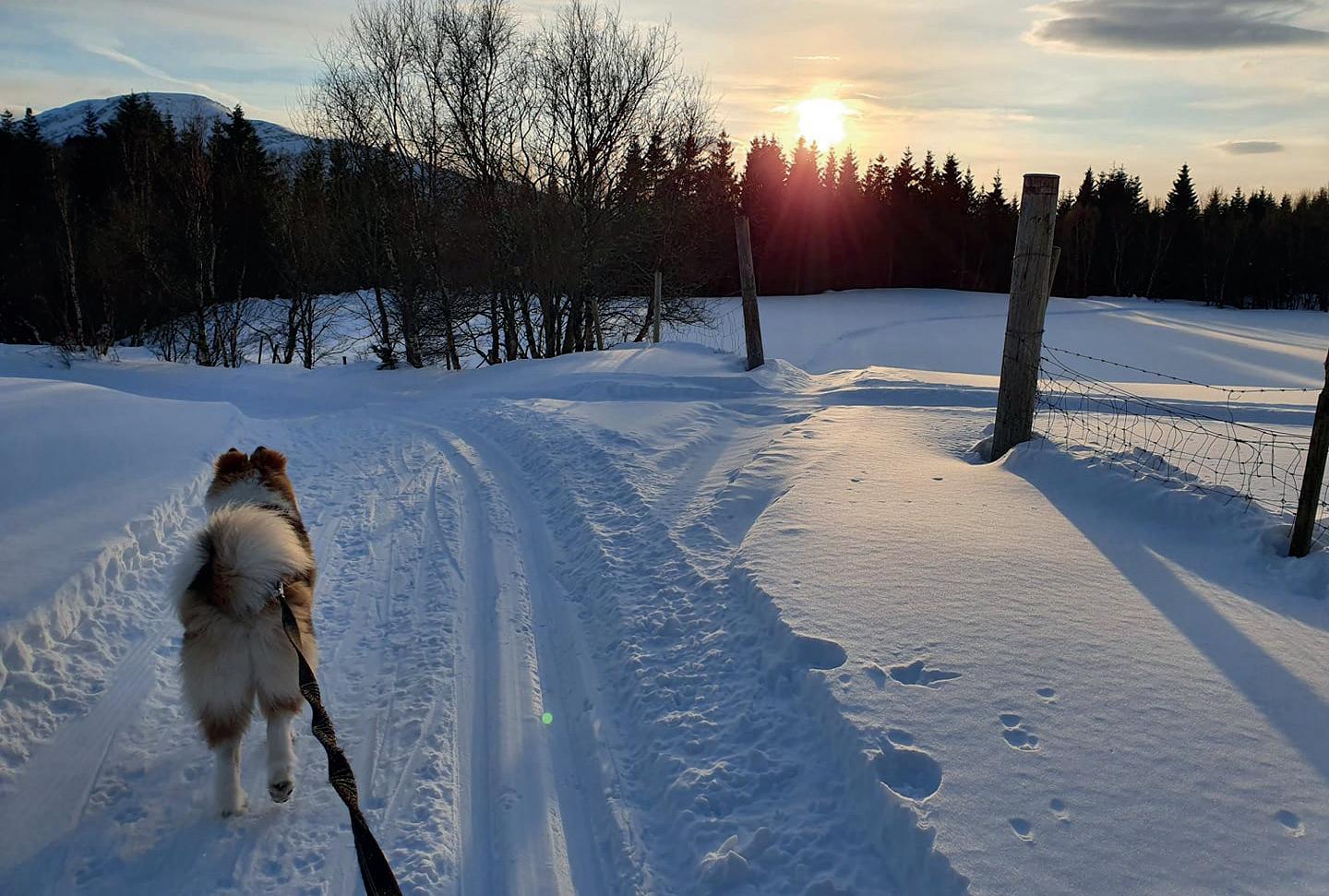 Dama med fjellskia har no vandra vidare, og Føniks kjem med nokre kort «boff» for å gi beskjed om at det er på tide å få opp farta. Han kjenner rekkefølgja godt, og ligg roleg og observerer medan eg pakkar tinga mine og legg hjelm og skibriller i sekken. Eg tek på meg sekken, låser bilen og legg skia på brøytekanten. Og då skrur hunden seg på. No kan det ikkje gå fort nok. Så dei første 2-300 metrane står eg berre roleg på skia med stavane under eine armen og let han dra meg innover første flata. Når me møter bratta veit eg at han roar seg.