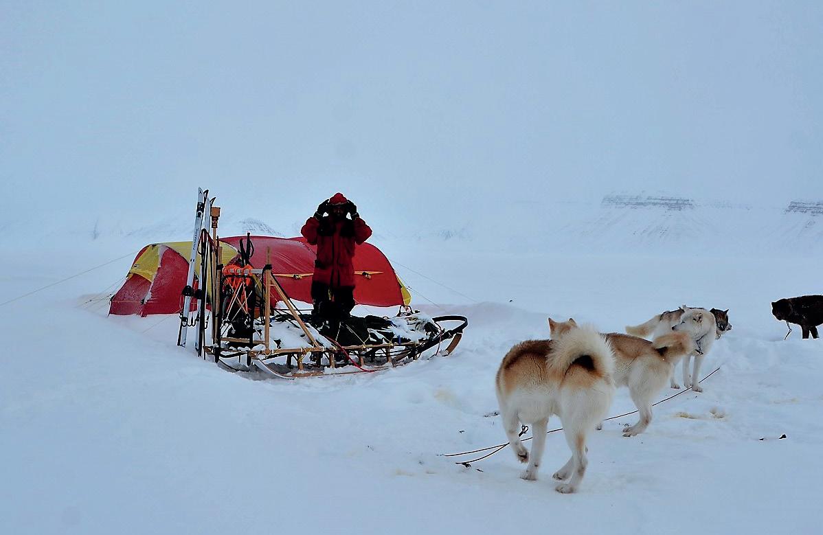 På formiddagen er værforhodene greie nok til at vi kunne reist nordover, men uten å ha fått nye forsyninger kan vi ikke ta sjansen. Vi må vente på forsyninger, så vi tar en sightseeing rundt leiren i stedet. Det første vi ser når vi beveger oss ti meter bort fra teltet er en fin rekke bjørnespor i snøen. Vi får en kraftig støkk av at bjørnen kan ha vært så nær uten at hundene har oppdaget den. Deretter tenker vi litt mer logisk og skjønner at sporene var avsatt før siste snøfall, og har bare kommet til syne nå etter at dagene med storm har blåst bort snøen som skjulte sporene. Vi tar en tur opp i fjellsiden også, og speider vel og lenge med kikkert i håp om å se skuterne med depotet komme innover