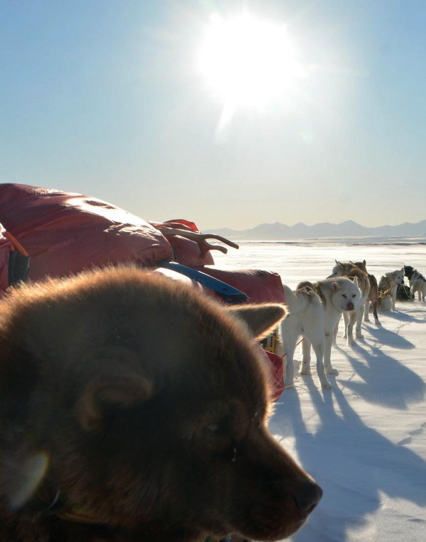 Siste sjanse for depot Med friskt mot og syv uthvilte hunder legger vi i vei utover Dicksonfjorden igjen. Eqqo er fortsatt passasjer. Hun har det egentlig som en dronning på sleden, men klager og jamrer så sant vi er i bevegelse. Vi har drøye to mil frem til der vi skal møte depot-kjørerne, så vi regner med å være temmelig slitne i ørene når vi kommer frem. Kanskje ørepropper hadde vært noe på neste tur? I dag går det virkelig unna på isen. Den sterke vinden har blåst bort all snøen og overvannet er frosset til et fast isdekke som er lett for hundene å løpe på. Det