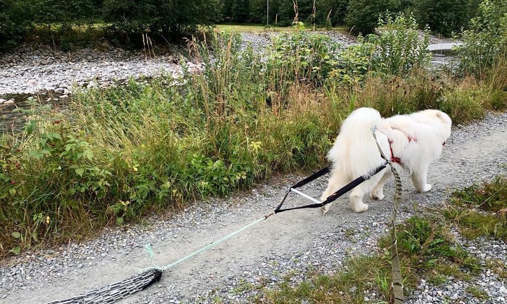 til noen belastning i denne alderen. Det er tilvenning av å ha på sele, nye lyder og frihetsberøvelse som trenes på. Så går man gjerne videre med 10% av hundens kroppsvekt når hunden er 9-12 mnd. Vær gjerne to personer første gang en legger kjettingen på. Den ene personen holder hunden i kobbel mens den andre person kaller hunden til seg. Start på ett rolig område. Underlaget bør være delvis mykt som en tursti, grusvei, fotballbane etc. Det er ikke anbefalt å trekke kjetting på harde underlag som asfalt eller betong. Dette kan gi store sliteskader, for lav friksjon og høye lyder. Når hunden kommer frem til den som kaller får den masse kos og ros. Så kan en etter hvert begynne å gå små turer med hunden i bånd med kjettingen. Start gjerne bare noen få 100 meter med ros og positiv forsterkning.