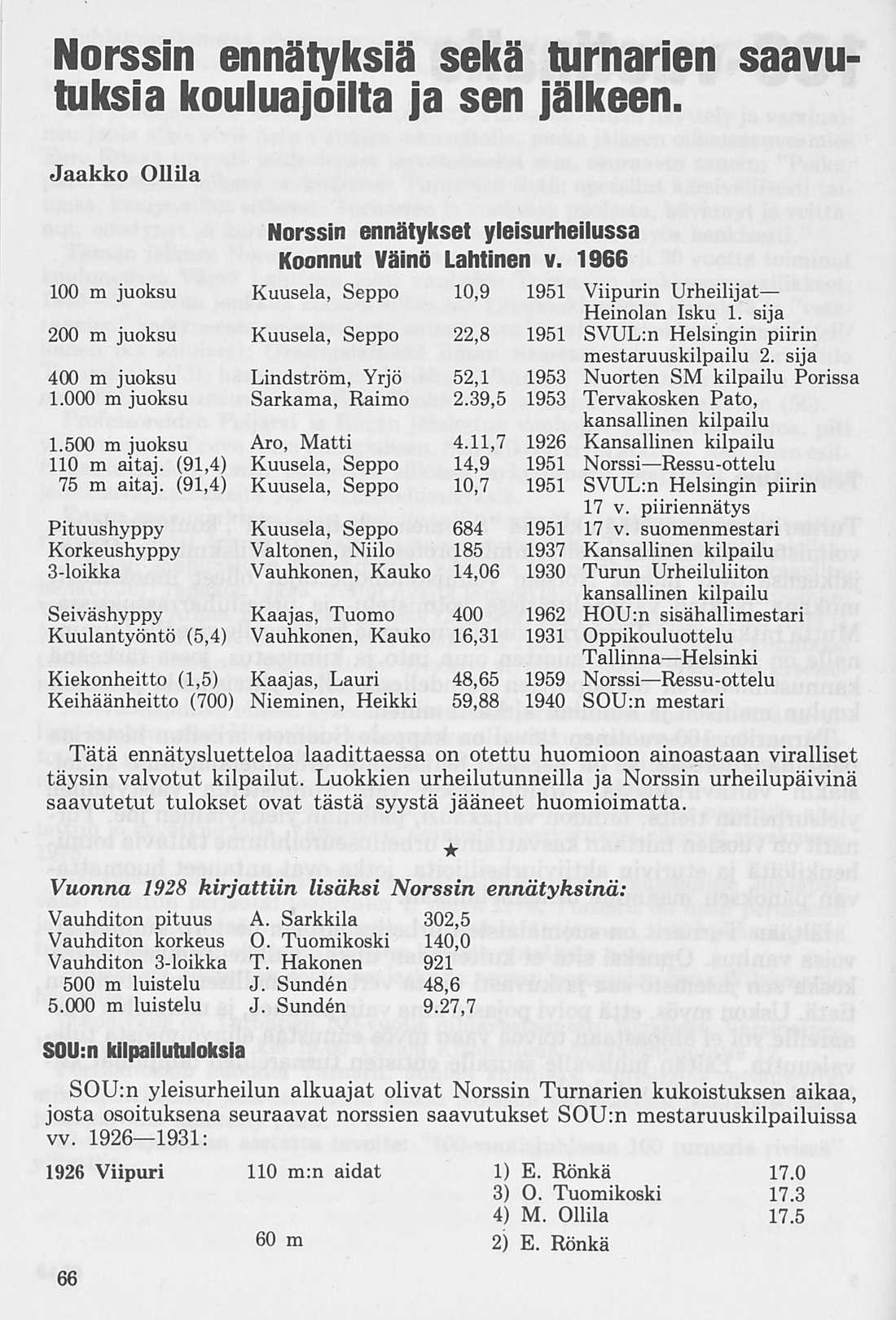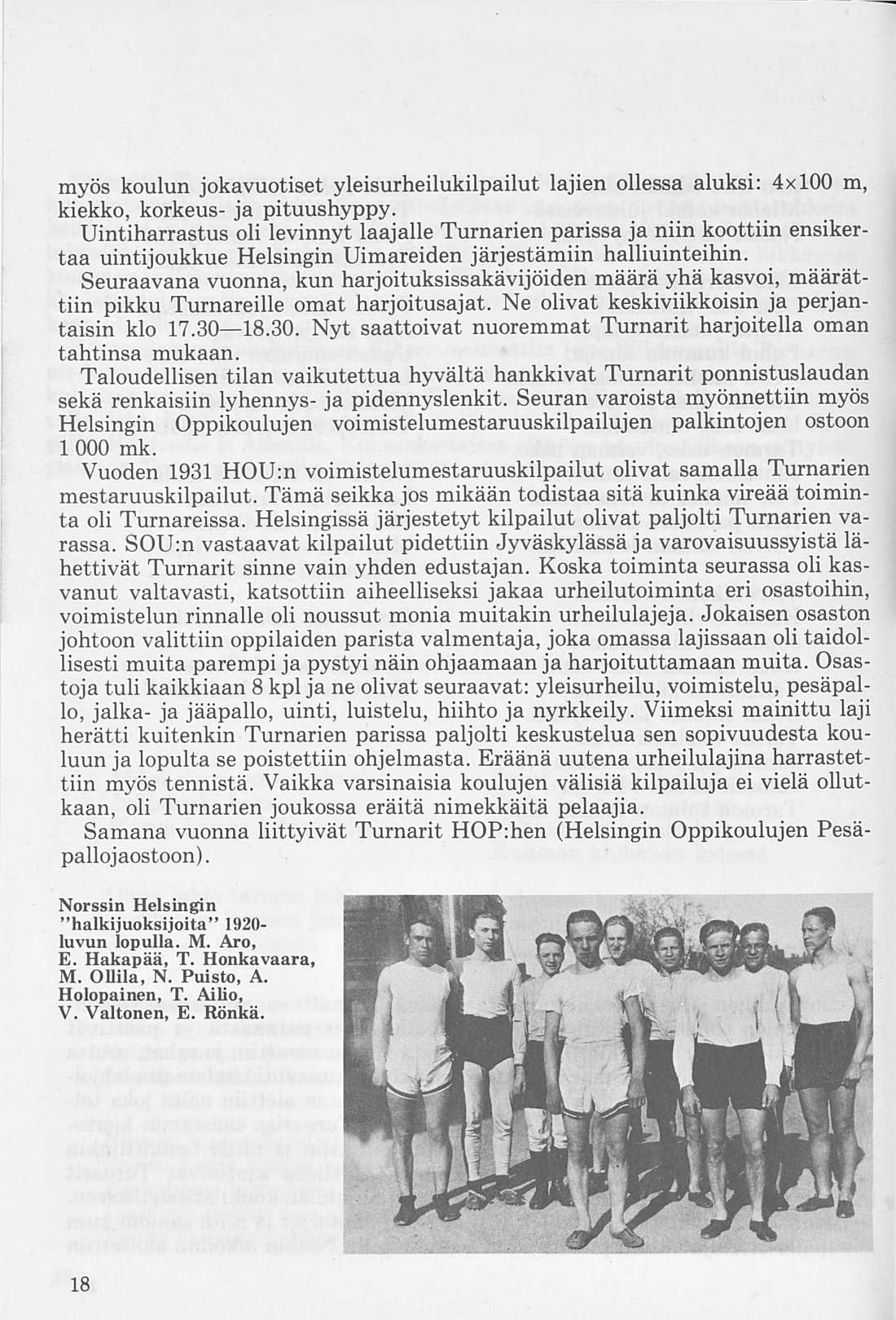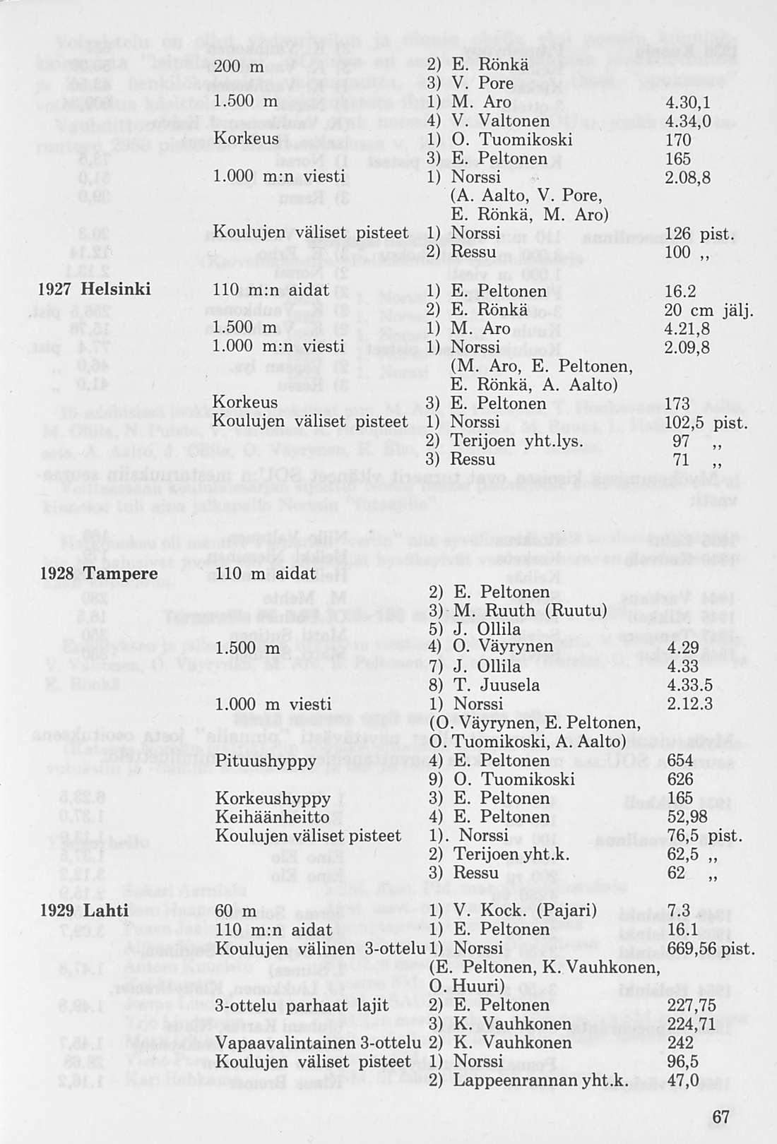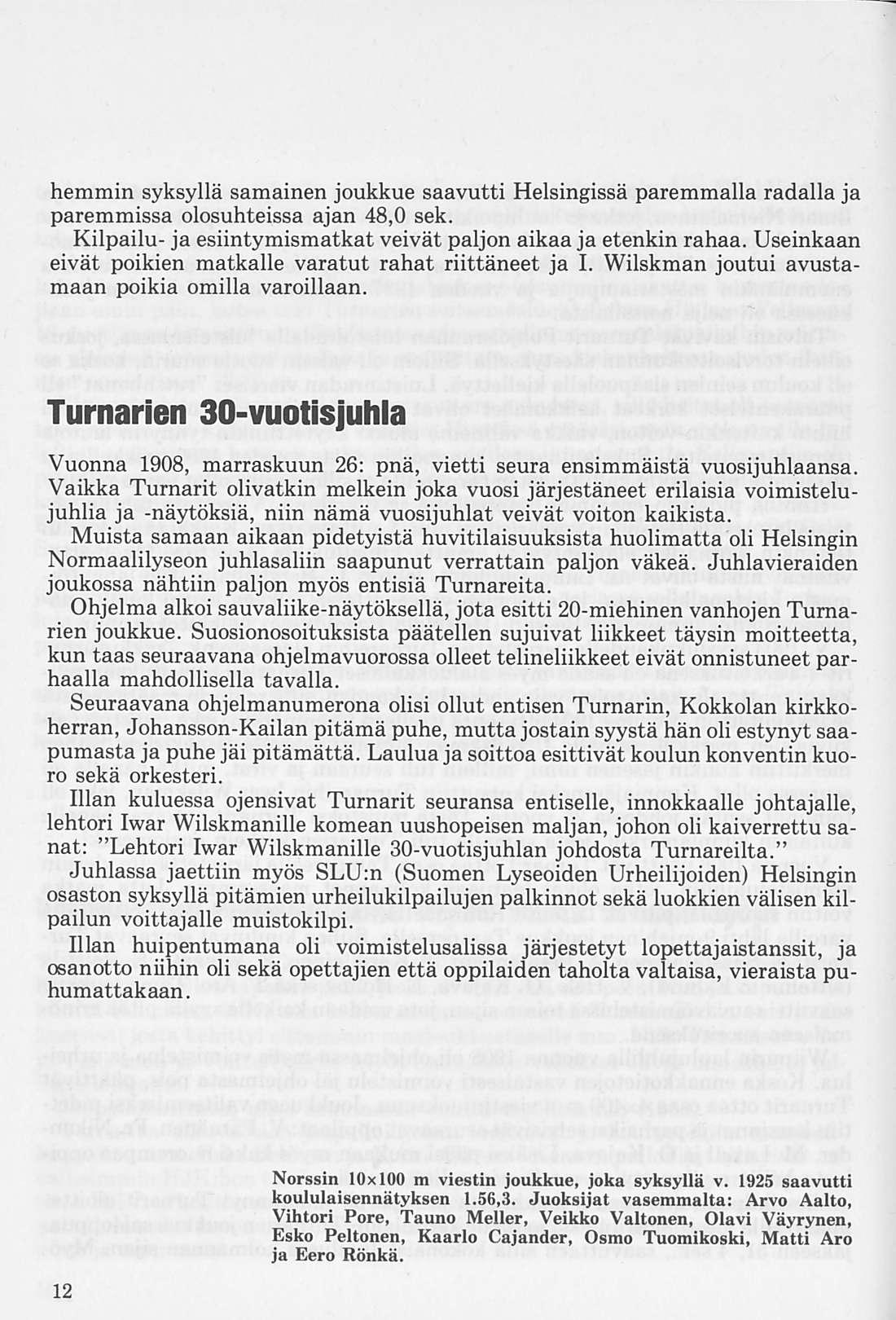 Norssin 10x100 m viestin joukkue, joka syksyllä v. 1925 saavutti koululaisennätyksen 1.56,3. Juoksijat vasemmalta; Arvo Aalto, Vihtori Pore, Tauno Meller, Veikko Valtonen, Olavi Väyrynen, Esko Peltonen, Kaarlo Cajander, Osmo Tuomikoski, Matti Aro ja Eero Rönkä.