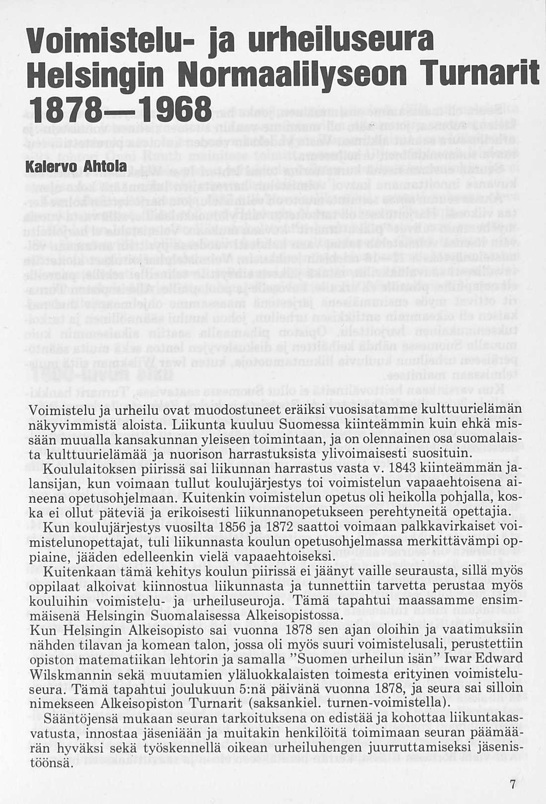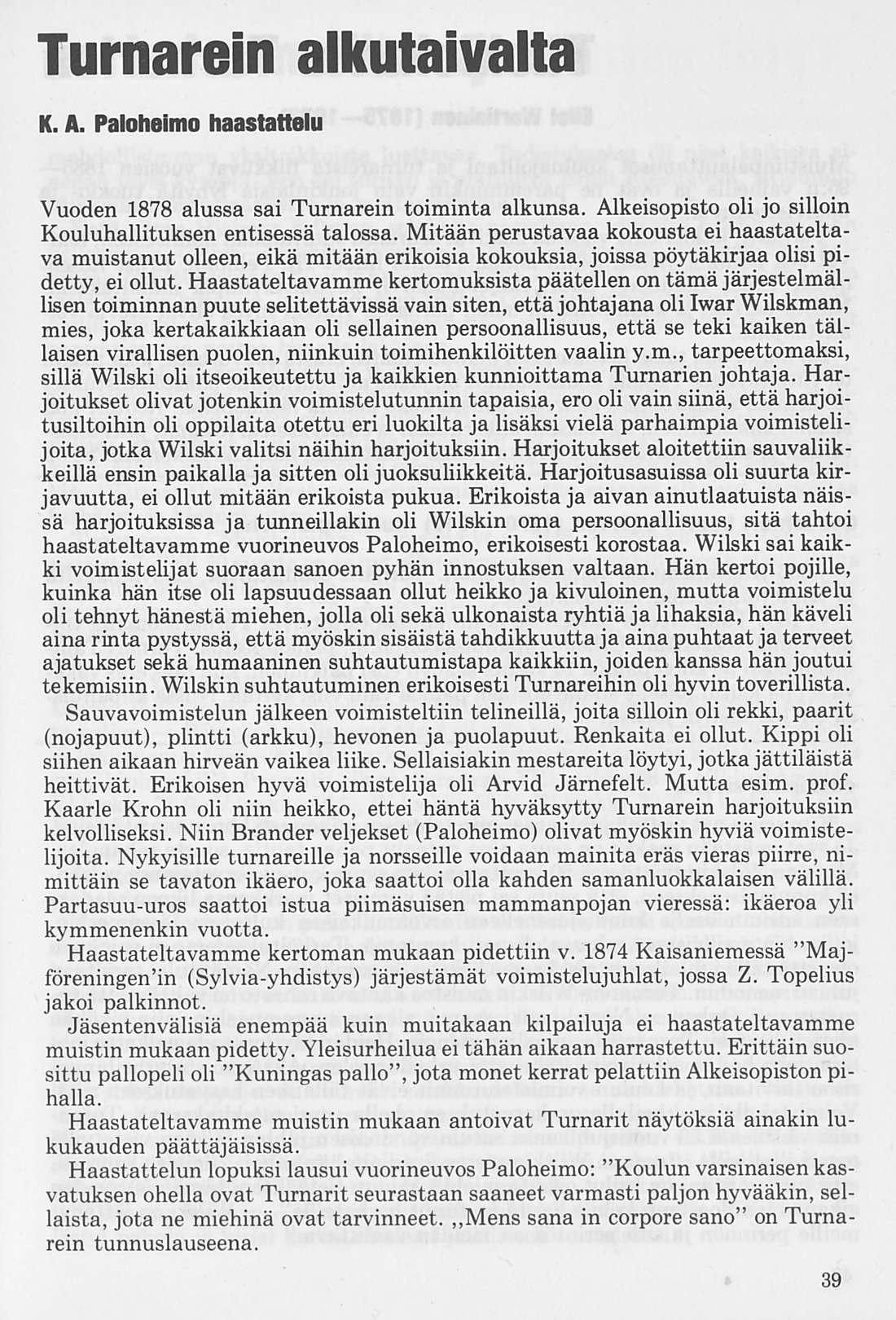 Kuitenkaan tämä kehitys koulun piirissä ei jäänyt vaille seurausta, sillä myös oppilaat alkoivat kiinnostua liikunnasta ja tunnettiin tarvetta perustaa myös kouluihin voimistelu- ja urheiluseuroja. Tämä tapahtui maassamme ensimmäisenä Helsingin Suomalaisessa Alkeisopistossa. Kun Helsingin Alkeisopisto sai vuonna 1878 sen ajan oloihin ja vaatimuksiin nähden tilavan ja komean talon, jossa oli myös suuri voimistelusali, perustettiin opiston matematiikan lehtorin ja samalla "Suomen urheilun isän” Iwar Edward Wilskmannin sekä muutamien yläluokkalaisten toimesta erityinen voimisteluseura. Tämä tapahtui joulukuun s:nä päivänä vuonna 1878, ja seura sai silloin nimekseen Alkeisopiston Turnarit (saksankiel. turnen-voimistella).