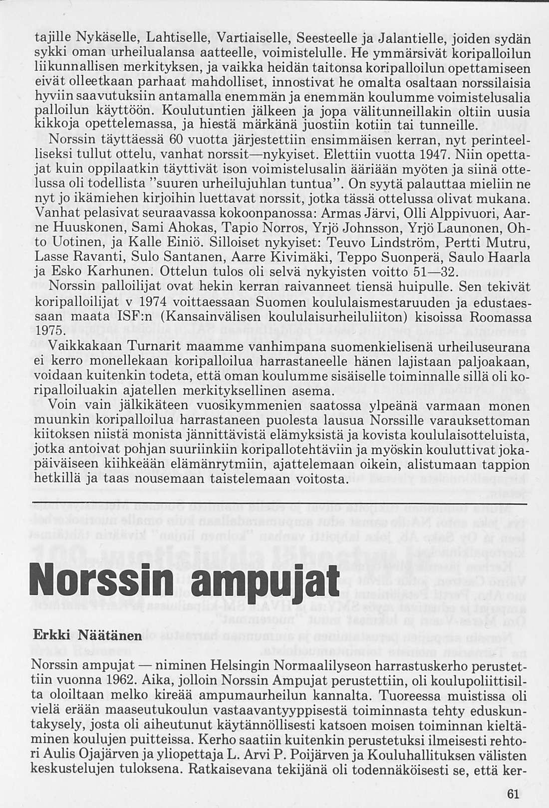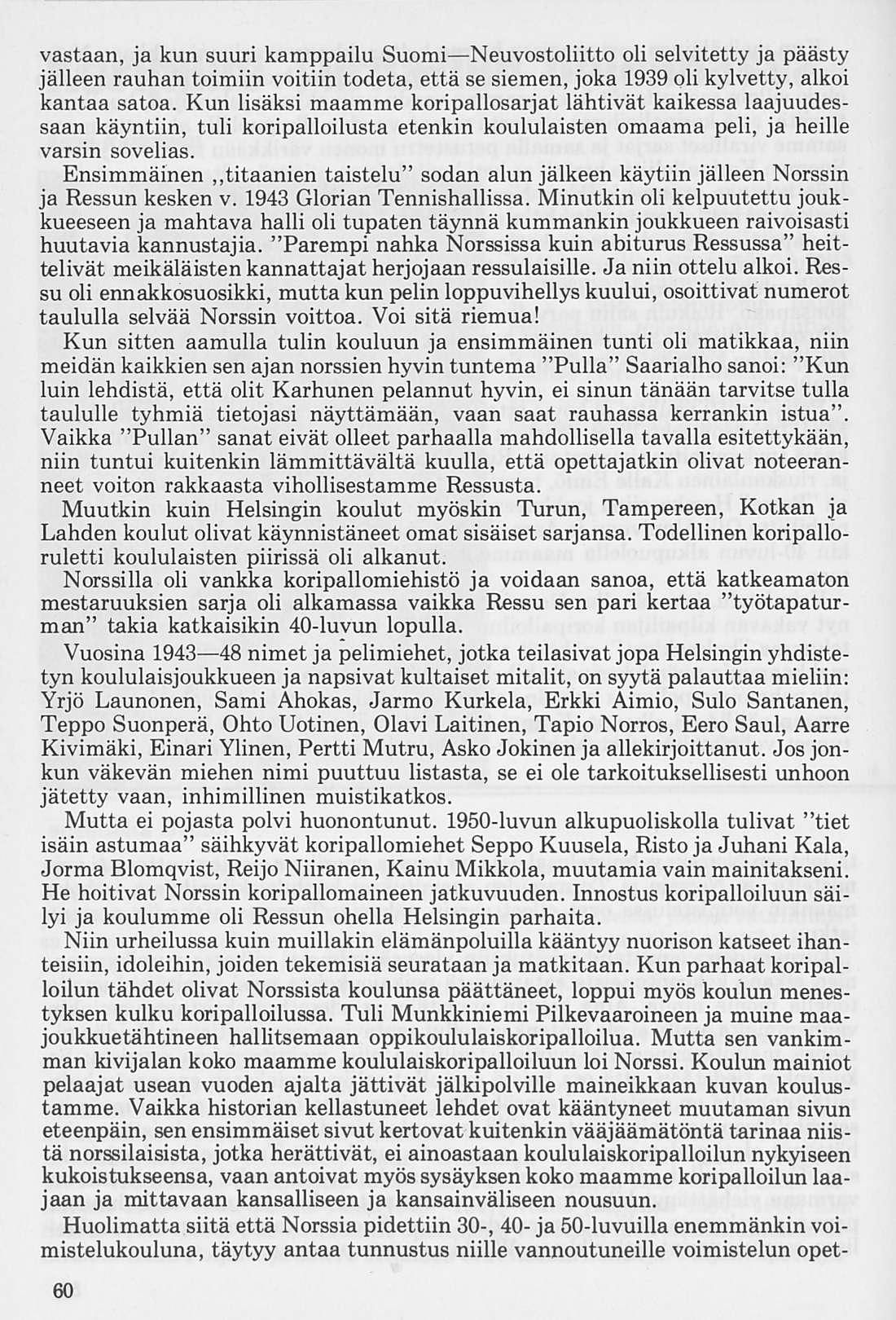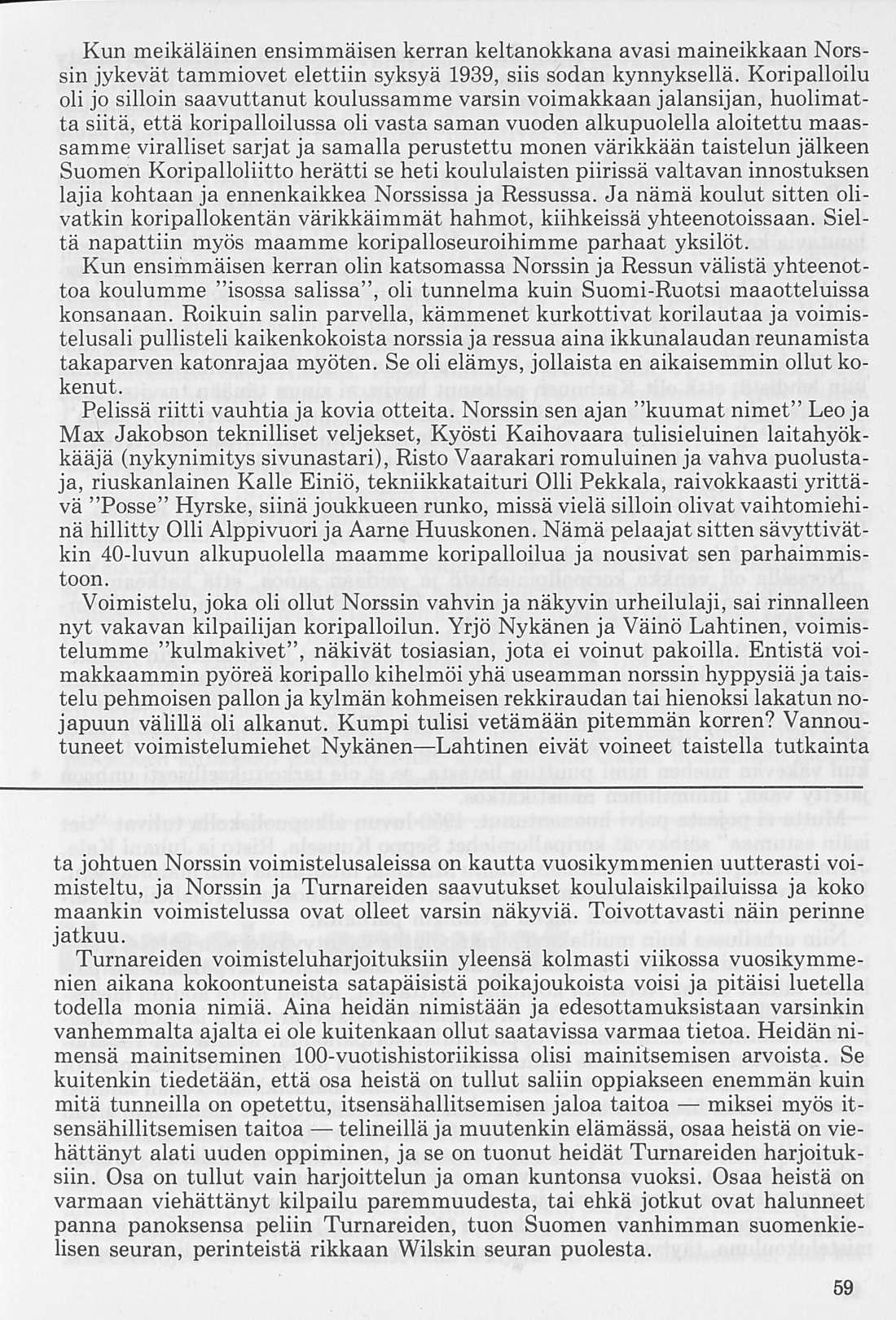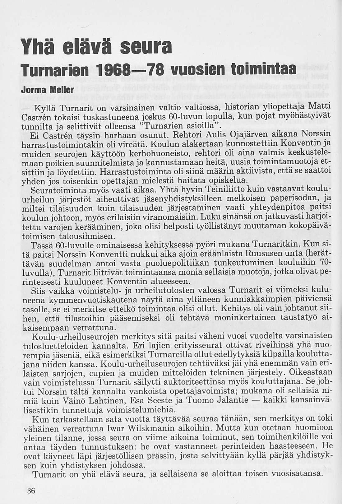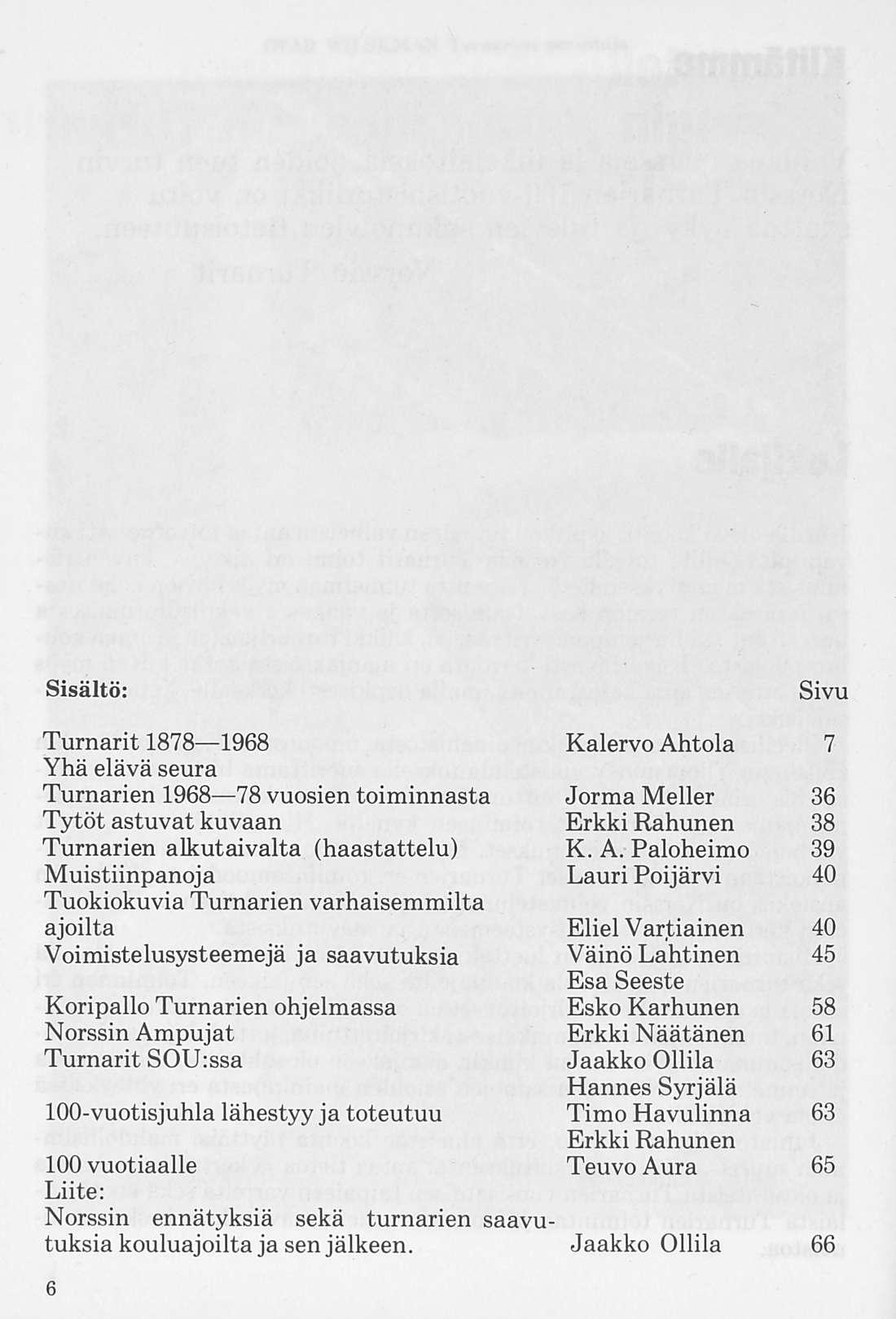 Käsillä oleva koonta jo pitkän taipaleen vaiheista antaa toivottavasti kuvan siitä, millä tavalla Norssin Turnarit toimi eri aikoina, kuvan riemuisista menestyksen hetkistä, mutta tunnelman myös häviön kohdatessa, osoituksen tarmon kasvattamisesta ja vankasta valmistautumisesta uuteen entistä hurjempaan yritykseen, kaikki turnarijoukon ja oman koulun puolesta. Toivottavasti kerronta eri ajanjaksoista antaa kuvan myös siitä, että me aina halusimme samalla henkisesti korkealle, kunnon kansalaisiksi.