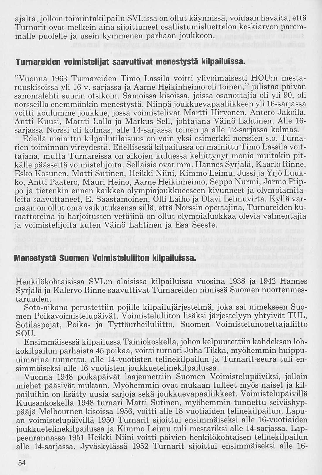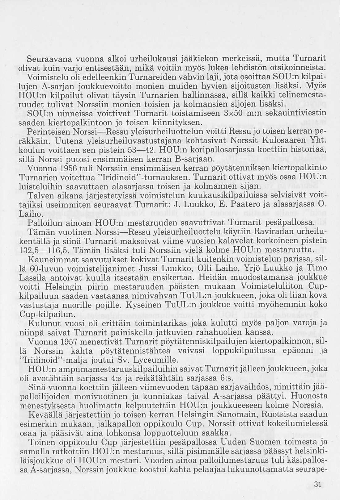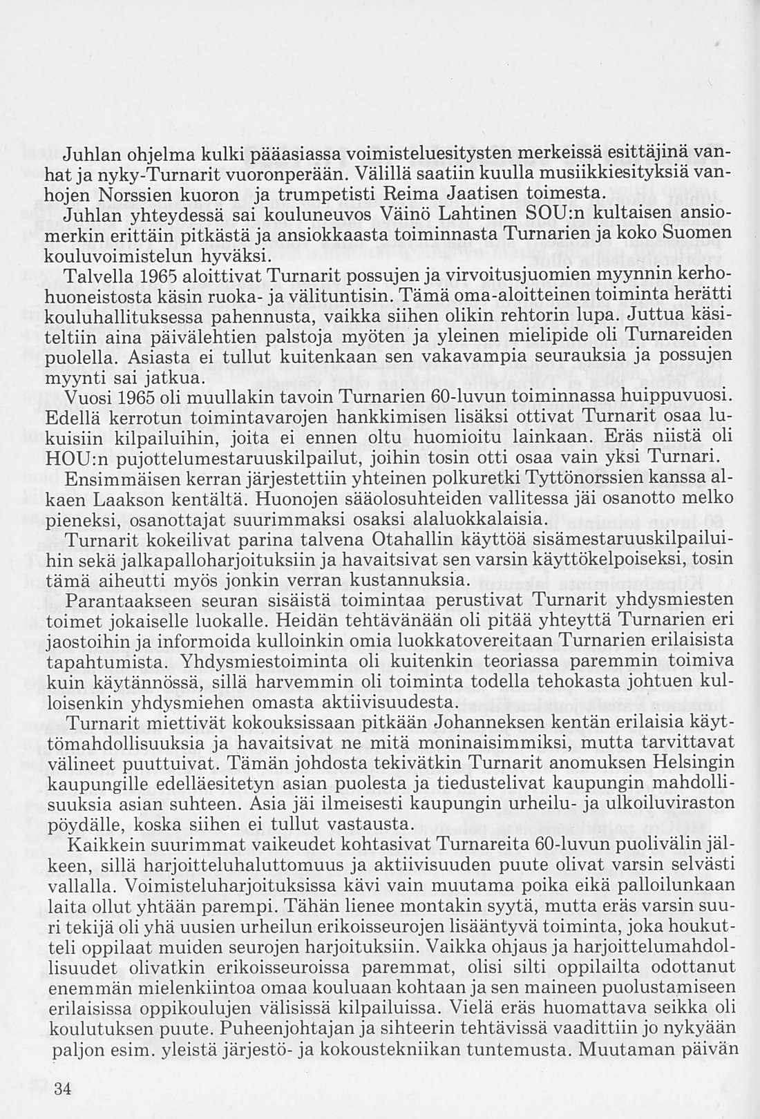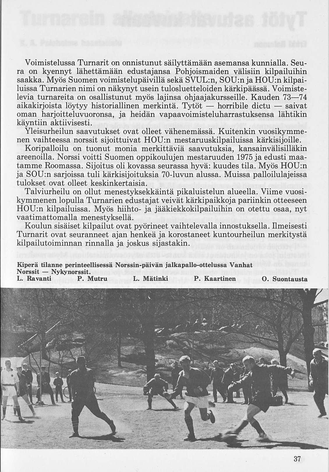 Oleellisen osan historiikin ainehistosta muodostaa Kalervo Ahtolan Helsingin Yliopiston Voimistelulaitoksella suorittama liikuntakasvatuksen historian erikoistyö. Puuttuva vuosikymmen on kuvattu asianomaisena ajanjaksona turnarina toimineen kynällä. Historiikkiä elävöittävät vanhojen turnarien kertomukset, haastattelut ja otteet heidän muistiinpanoistaan sekä selostukset Turnarien eri toimintamuodoista. Erikoisen ansiokas on Norssin voimistelunopettajien Väinö Lahtisen ja Esa Seesteen kertomus voimistelusysteemeistä ja saavutuksista.