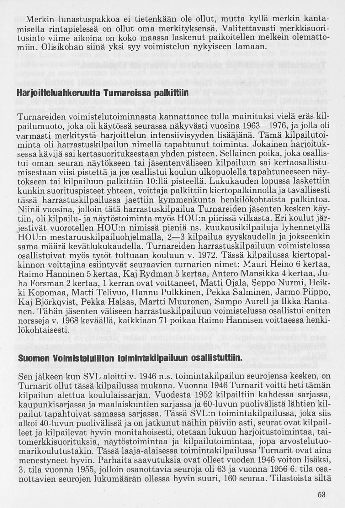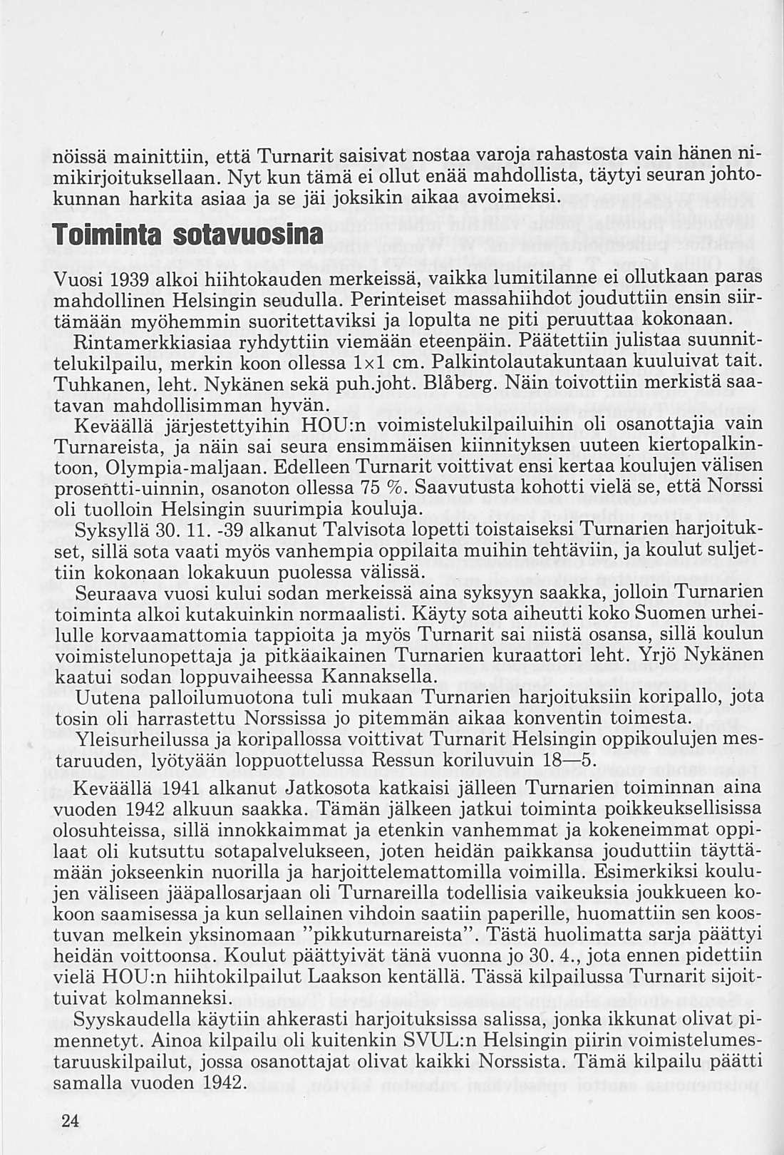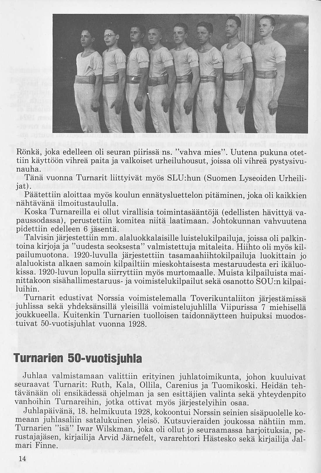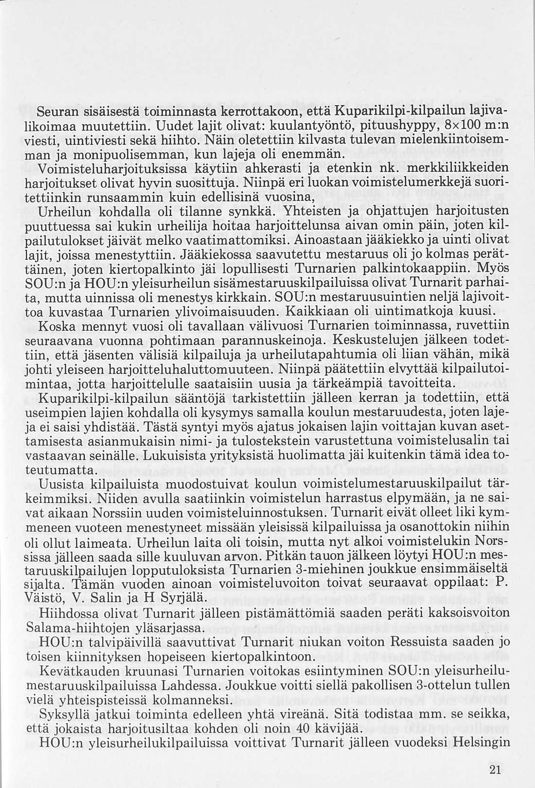 Oleellisen osan historiikin ainehistosta muodostaa Kalervo Ahtolan Helsingin Yliopiston Voimistelulaitoksella suorittama liikuntakasvatuksen historian erikoistyö. Puuttuva vuosikymmen on kuvattu asianomaisena ajanjaksona turnarina toimineen kynällä. Historiikkiä elävöittävät vanhojen turnarien kertomukset, haastattelut ja otteet heidän muistiinpanoistaan sekä selostukset Turnarien eri toimintamuodoista. Erikoisen ansiokas on Norssin voimistelunopettajien Väinö Lahtisen ja Esa Seesteen kertomus voimistelusysteemeistä ja saavutuksista.