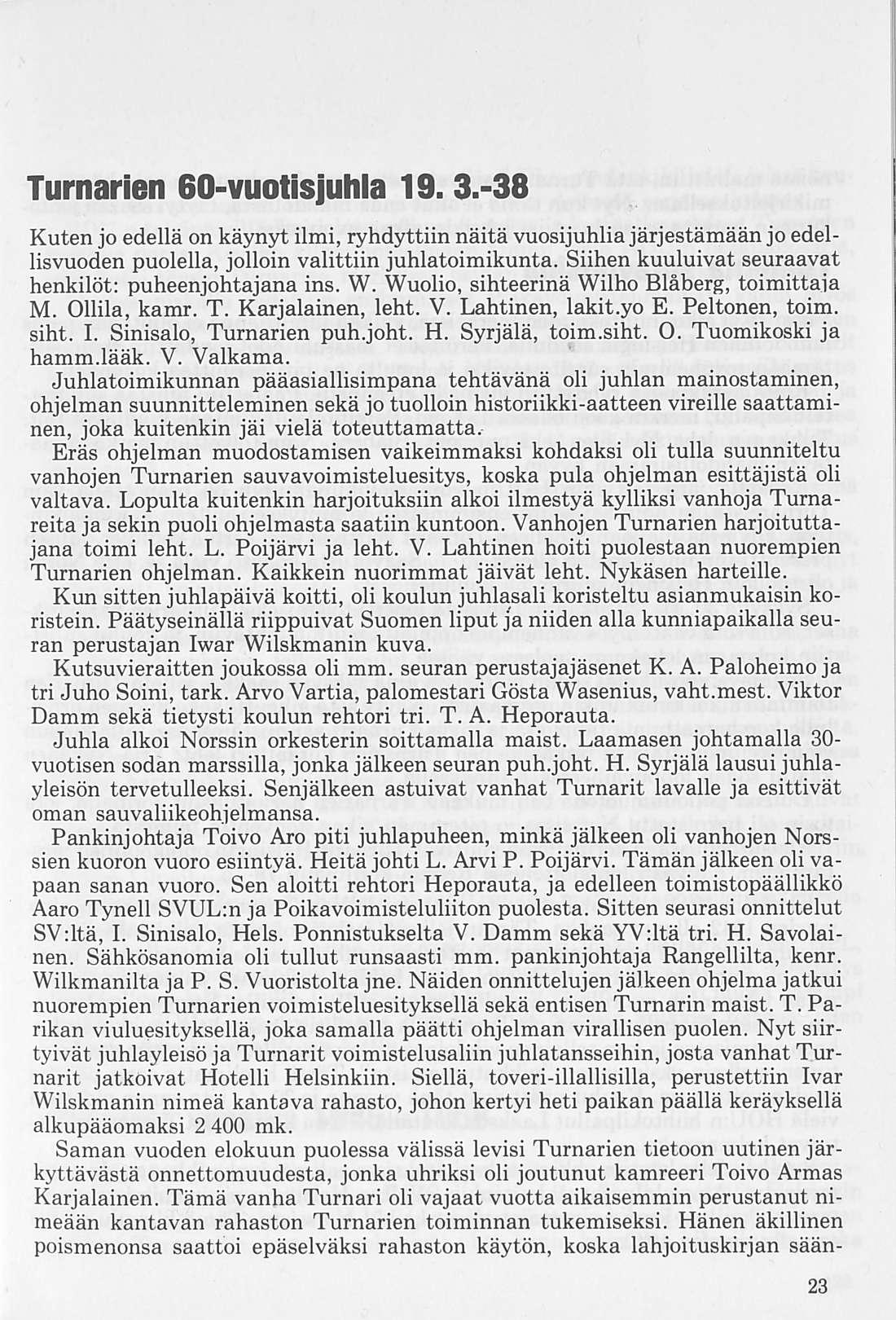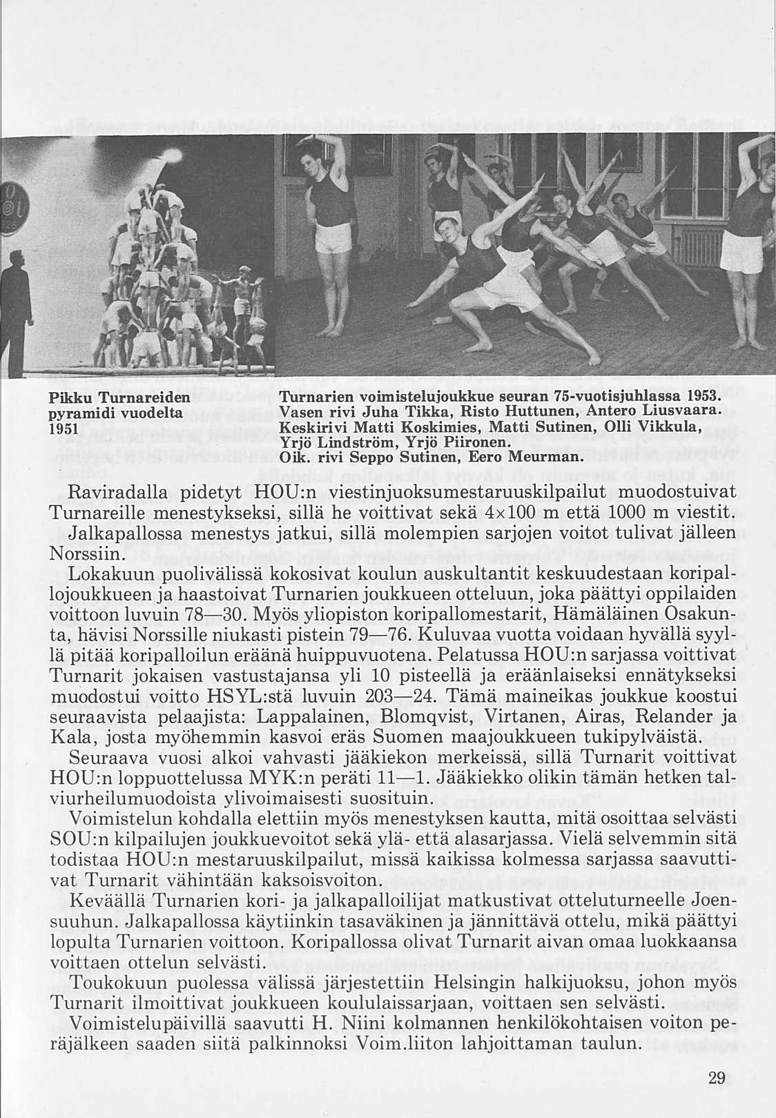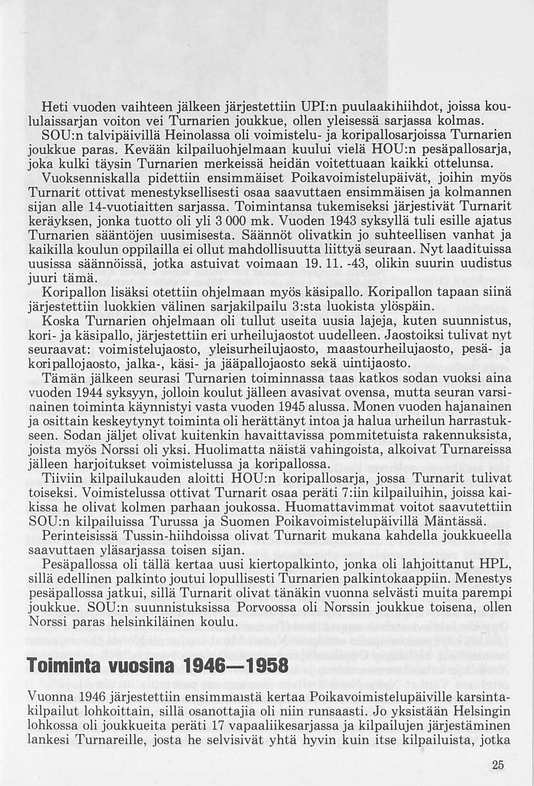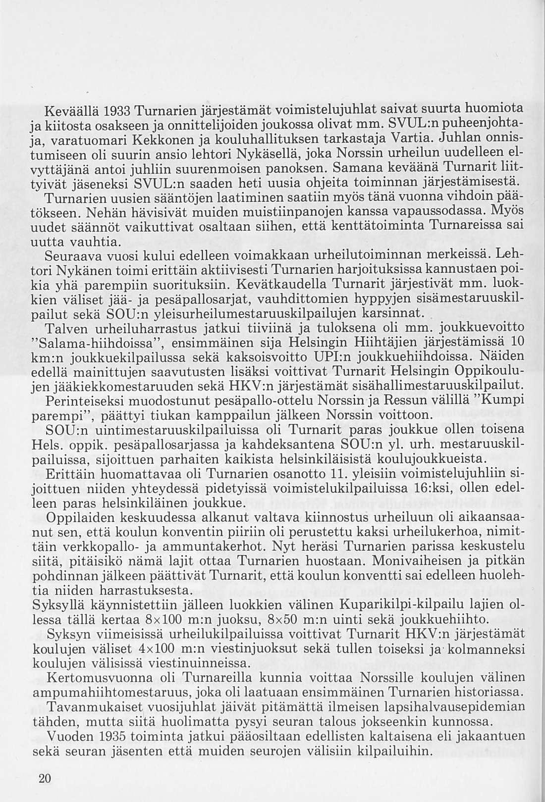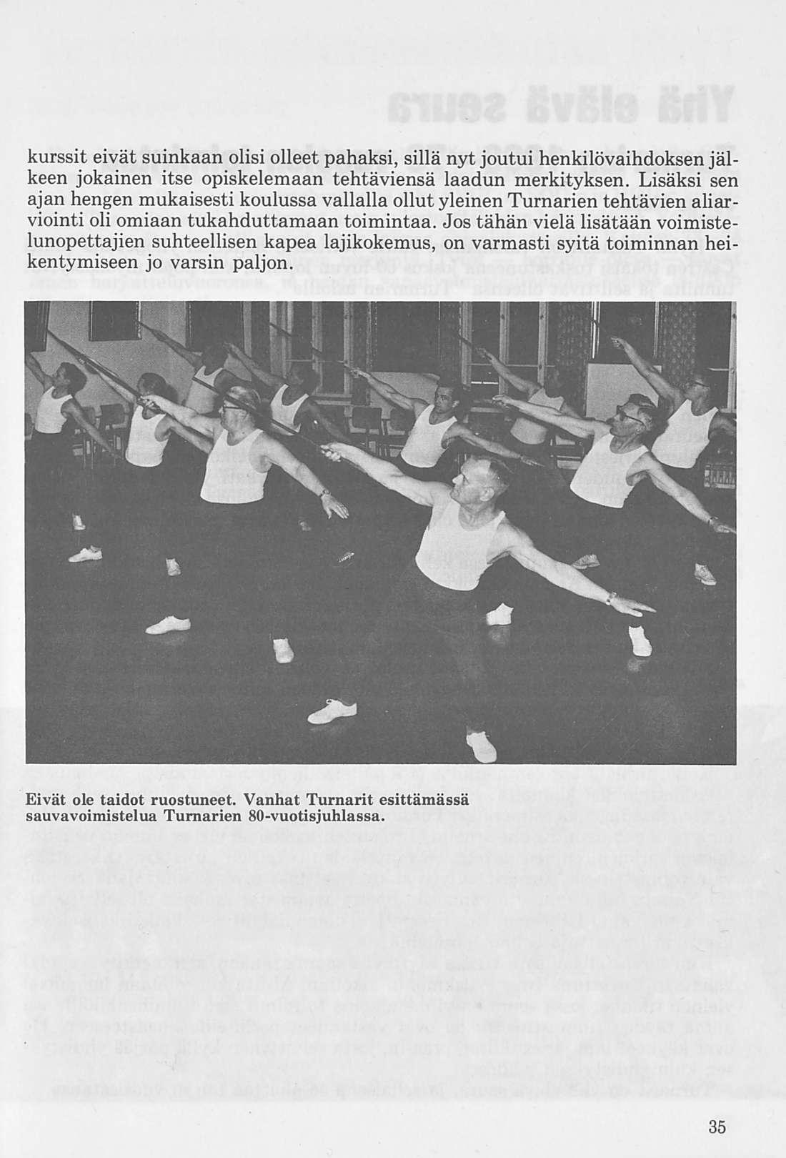Oleellisen osan historiikin ainehistosta muodostaa Kalervo Ahtolan Helsingin Yliopiston Voimistelulaitoksella suorittama liikuntakasvatuksen historian erikoistyö. Puuttuva vuosikymmen on kuvattu asianomaisena ajanjaksona turnarina toimineen kynällä. Historiikkiä elävöittävät vanhojen turnarien kertomukset, haastattelut ja otteet heidän muistiinpanoistaan sekä selostukset Turnarien eri toimintamuodoista. Erikoisen ansiokas on Norssin voimistelunopettajien Väinö Lahtisen ja Esa Seesteen kertomus voimistelusysteemeistä ja saavutuksista.