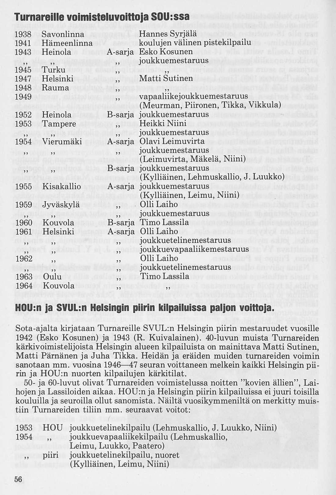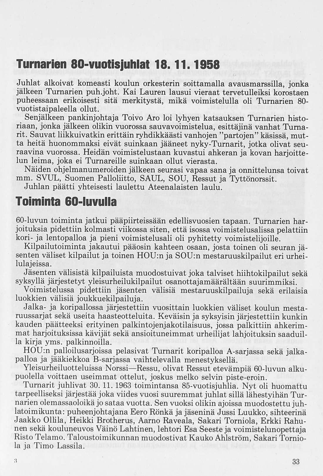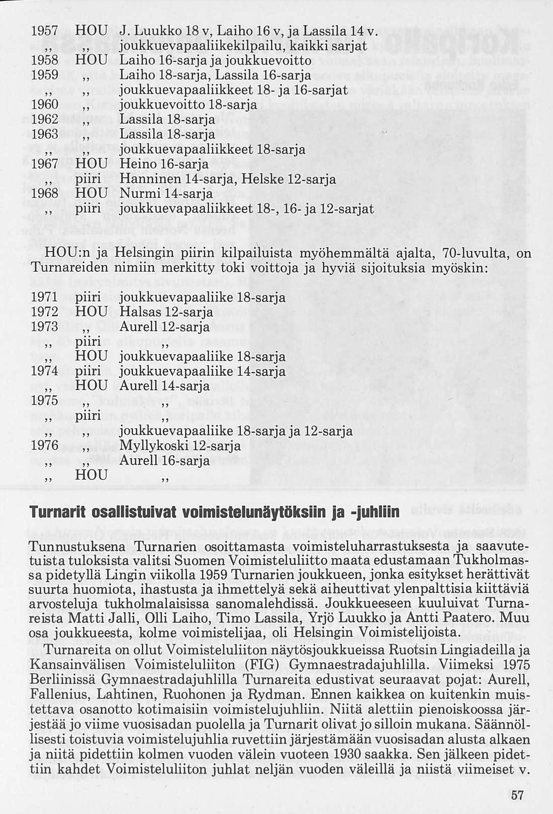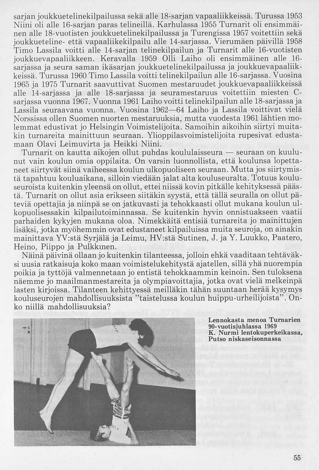 Oleellisen osan historiikin ainehistosta muodostaa Kalervo Ahtolan Helsingin Yliopiston Voimistelulaitoksella suorittama liikuntakasvatuksen historian erikoistyö. Puuttuva vuosikymmen on kuvattu asianomaisena ajanjaksona turnarina toimineen kynällä. Historiikkiä elävöittävät vanhojen turnarien kertomukset, haastattelut ja otteet heidän muistiinpanoistaan sekä selostukset Turnarien eri toimintamuodoista. Erikoisen ansiokas on Norssin voimistelunopettajien Väinö Lahtisen ja Esa Seesteen kertomus voimistelusysteemeistä ja saavutuksista.