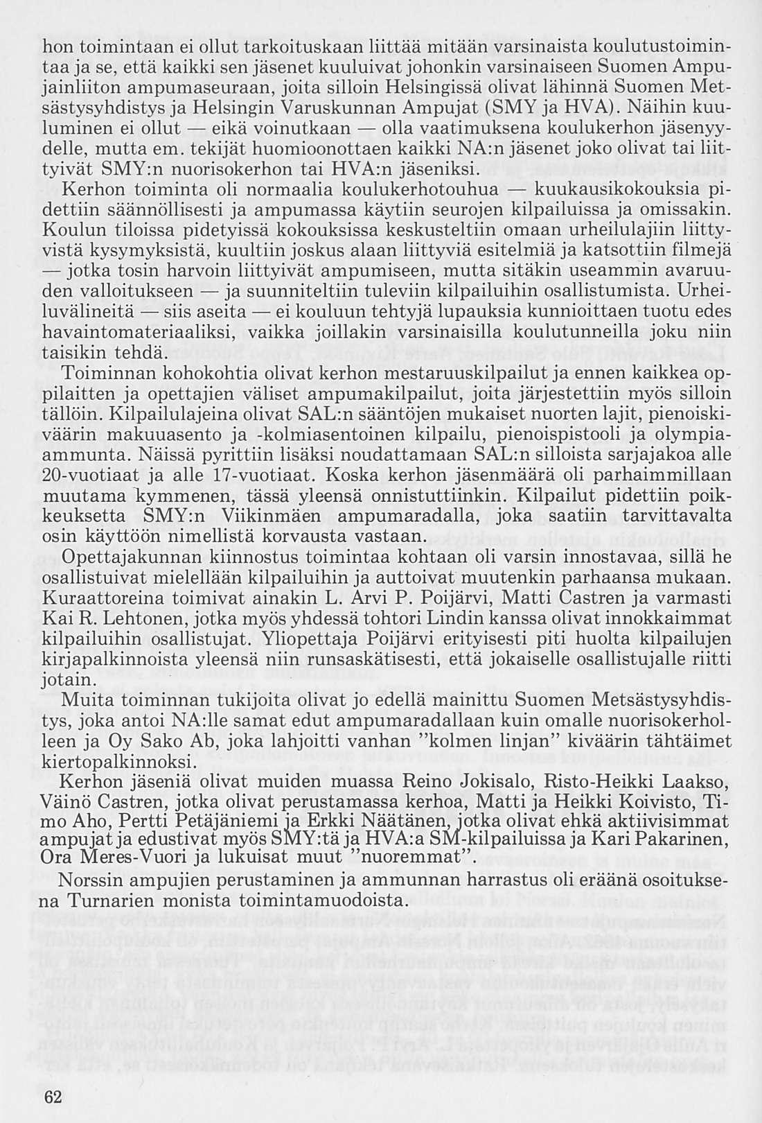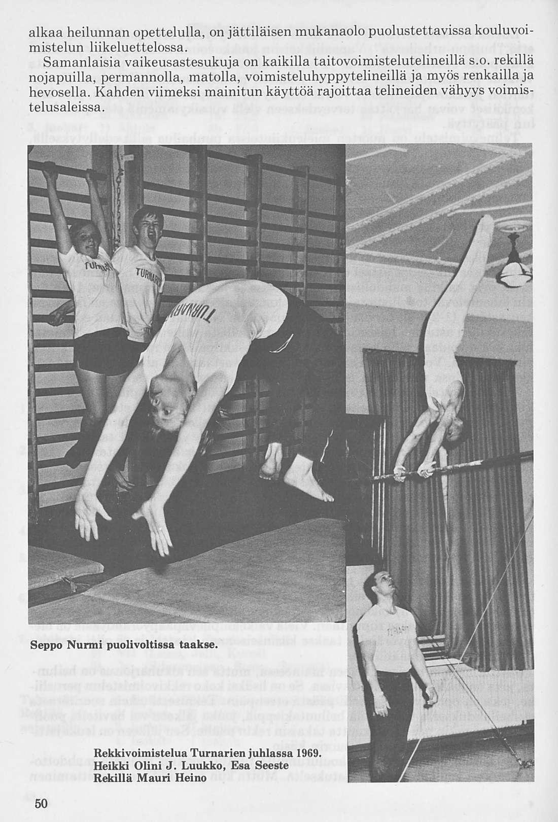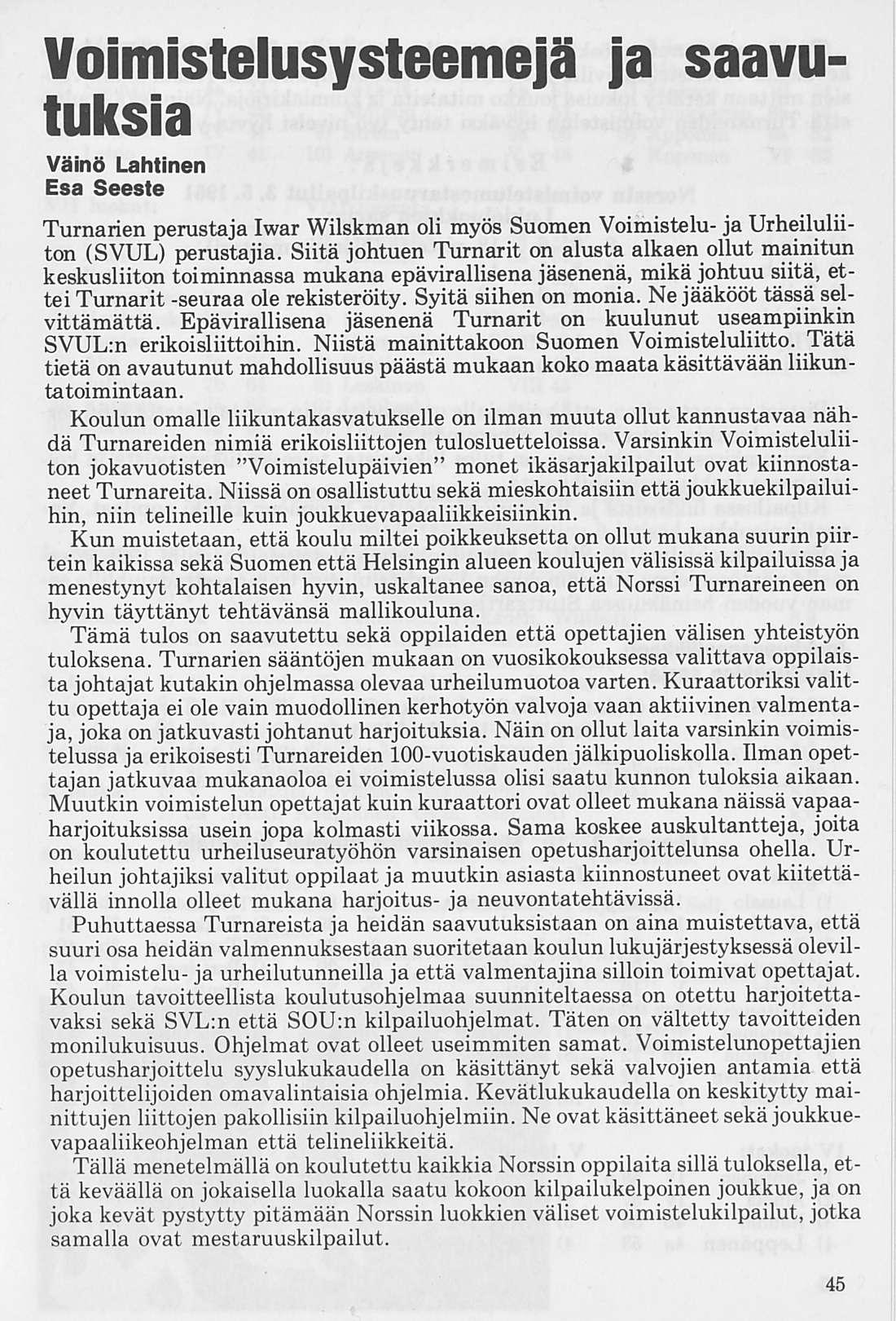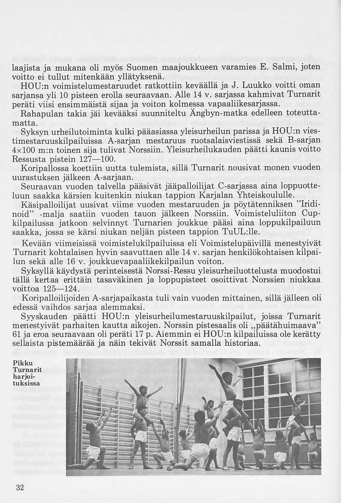 Oleellisen osan historiikin ainehistosta muodostaa Kalervo Ahtolan Helsingin Yliopiston Voimistelulaitoksella suorittama liikuntakasvatuksen historian erikoistyö. Puuttuva vuosikymmen on kuvattu asianomaisena ajanjaksona turnarina toimineen kynällä. Historiikkiä elävöittävät vanhojen turnarien kertomukset, haastattelut ja otteet heidän muistiinpanoistaan sekä selostukset Turnarien eri toimintamuodoista. Erikoisen ansiokas on Norssin voimistelunopettajien Väinö Lahtisen ja Esa Seesteen kertomus voimistelusysteemeistä ja saavutuksista.